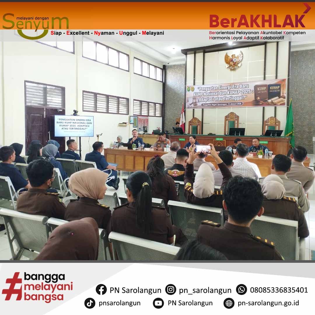 Selasa, 13 Januari 2026 - Bertempat di Ruang Sidang Cakra Pengadilan Negeri Sarolangun, sekitar pukul 09.00 WIB, Pengadilan Negeri Sarolangun meaksanakan rapat koordinasi dengan tema Penguatan Sinergi Era Baru KUHP Nasional dan KUHAP 2025: Adaptasi atau Tertinggal? antar lembaga penegak hukum di Kabupaten Sarolangun. Kegiatan ini dalam rangka penguatan sinergi antara KUHP Nasional baru dan KUHAP 2025 (yang berlaku efektif 2026) berfokus pada harmonisasi substansi materiil (KUHP) dan materiil acara (KUHAP) untuk mewujudkan keadilan substantif, dengan memperkuat koordinasi antar penegak hukum (Polri, Kejaksaan, Hakim) melalui pertukaran data, bantuan pengamanan, dan pelatihan, serta mengakomodir kearifan lokal, keadilan restoratif, dan mempercepat kepastian hukum bagi masyarakat. Acara dihadiri oleh undangan dari lembaga terkait, yaitu Kejaksaan Negeri Sarolangun, Kepolisian Resor Sarolangun, Lembaga Pemasyarakatan Kabupaten Sarolangun, dan Pos Bantuan Hukum (Posbakum) dari Garda Duta Keadilan.