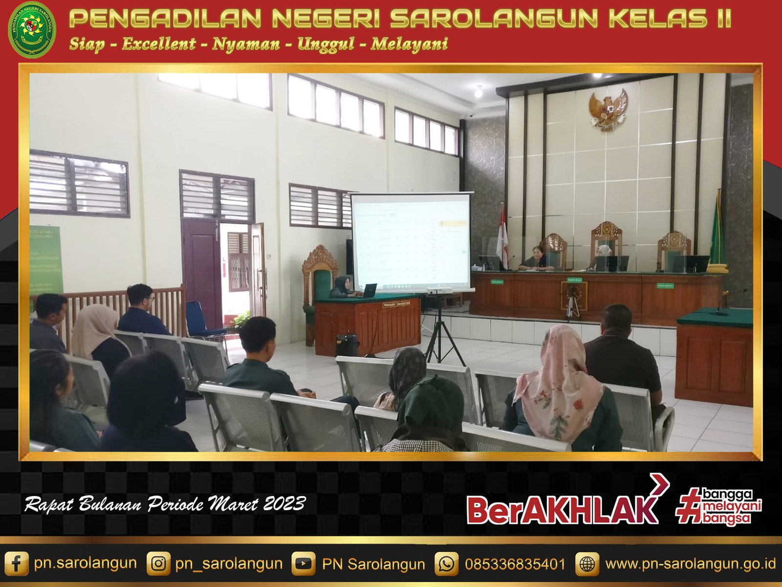 Selasa, 28 Maret 2023 - Pimpinan bersama ASN dan PPNPN Pengadilan Negeri Sarolangun melaksanakan rapat koordinasi bulan Maret 2023. Rapat ini dilaksanakan di Ruang Sidang Cakra PN sarolangun, sekitar pukul 08.30 WIB. Rapat diawali dengan pembahasan mengenai point Evaluasi Implementasi SIPP (EIS) PN Saroalngun.