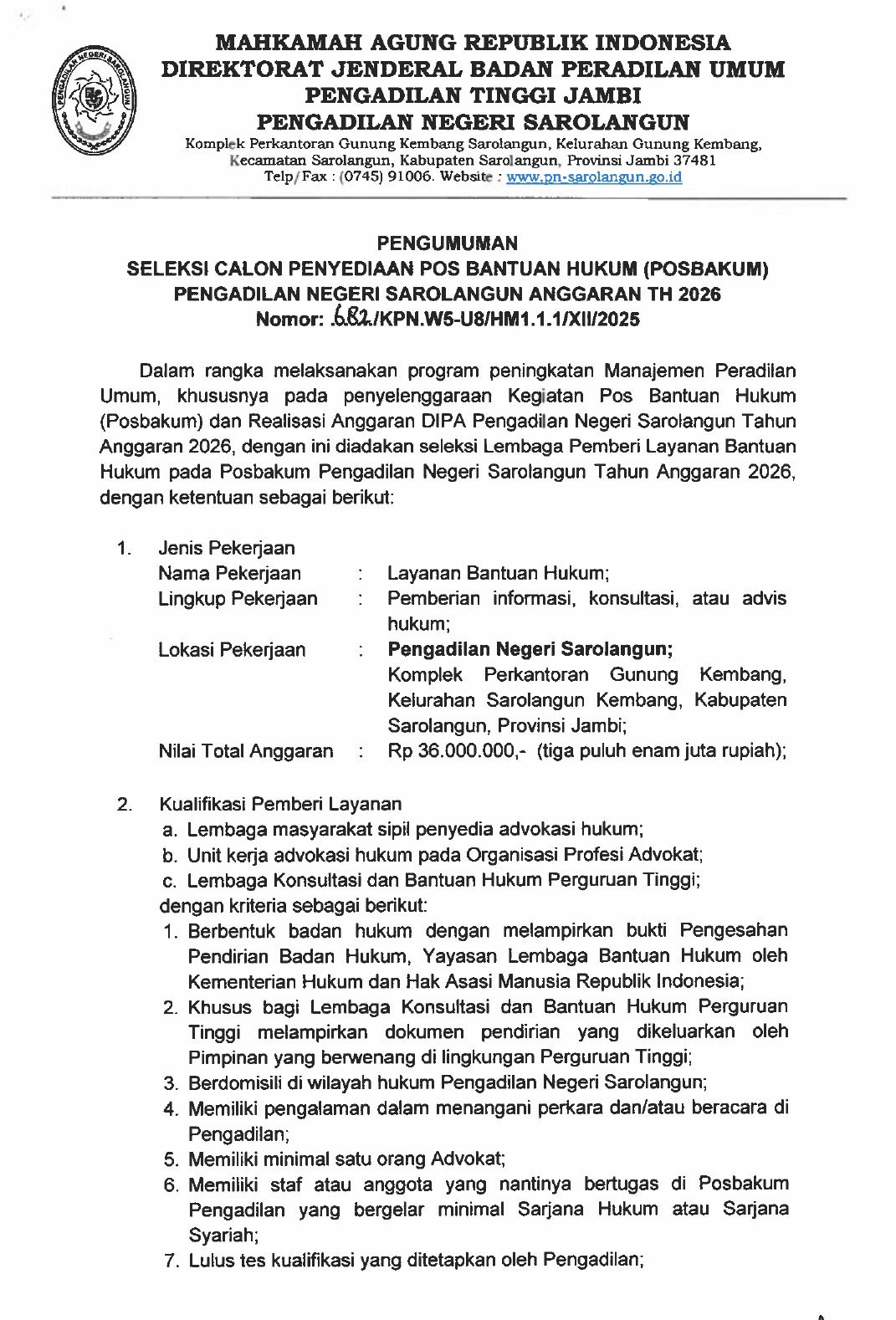 Rabu, 10 Desember 2026 - Pengadilan Negeri Sarolangun mengumumkan bahwa seleksi calon penyedia layanan Pos Bantuan Hukum (Posbakum) untuk Tahun Anggaran 2026 resmi dibuka.