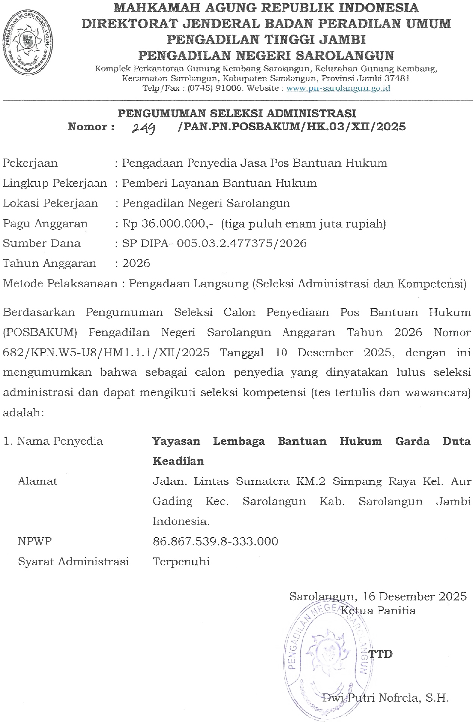 Kamis, 18 Desember 2025 - Merujuk hasil seleksi Tim Teknis Pengadaan Penyedia Pos Bantuan Hukum (POSBAKUM) pada Pengadilan Negeri Sarolangun Tahun Anggaran 2026, berupa pemeriksaan kelengkapan administrasi berkas. Maka, tim menyatakan bahwa peserta yang lolos adalah Yayasan Lembaga Bantuan Hukum Garda Duta Keadilan.