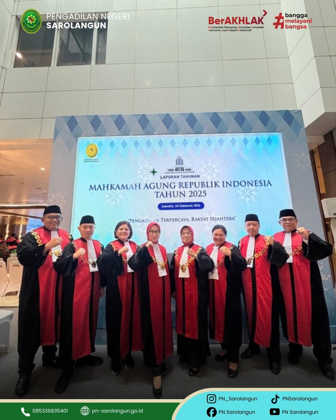 Selasa, 10 Februari 2025 - Mahkamah Agung Republik Indonesia melaksanakan Laporan Tahunan Tahun 2025 dan Kampung Hukum pada tanggal 9 dan 10 Februari 2026. Turut hadir dan menjadi bagian dari deretatan hadirin adalah Ketua Pengadilan Negeri Sarolangun Ibu Novarina Manurung, S.H. Sidang Istimewa Laporan Tahunan (Laptah) Mahkamah Agung dipimpin dan dibuka oleh Ketua Mahkamah Agung Republik Indonesia Prof. Dr. H. Sunarto, S.H., M.H. pada hari Selasa, 10 Februari 2026 pukul 09.00. WIB di Gedung Mahkamah Agung, Jakarta.