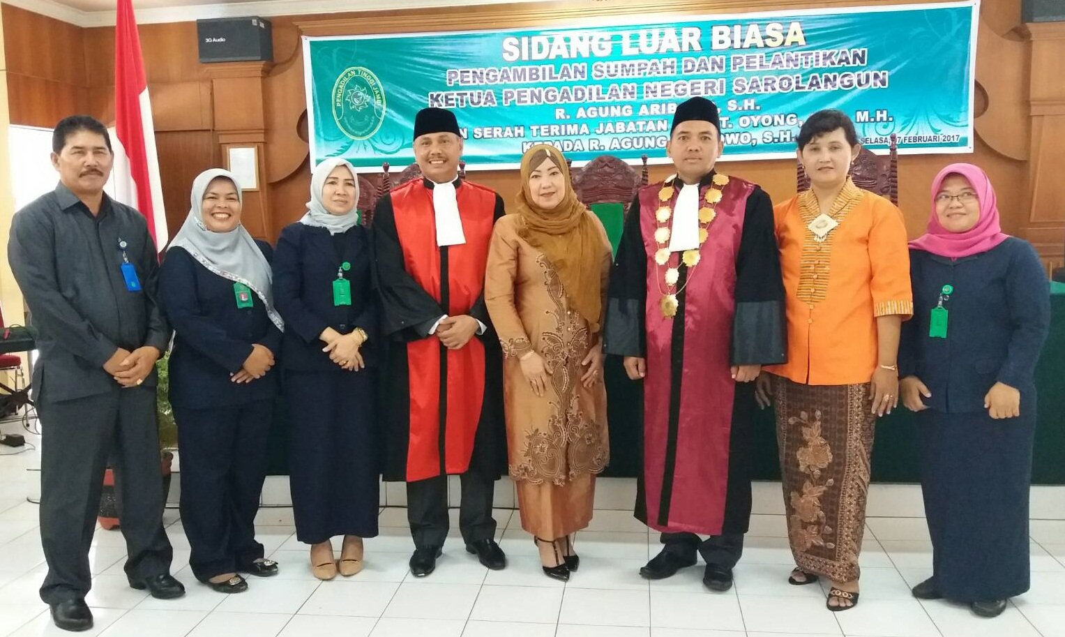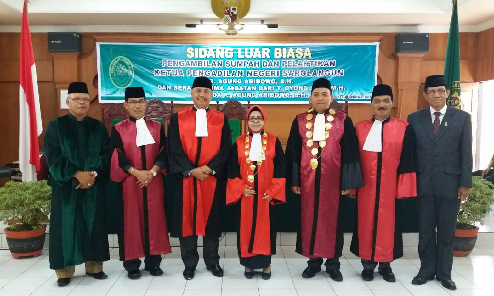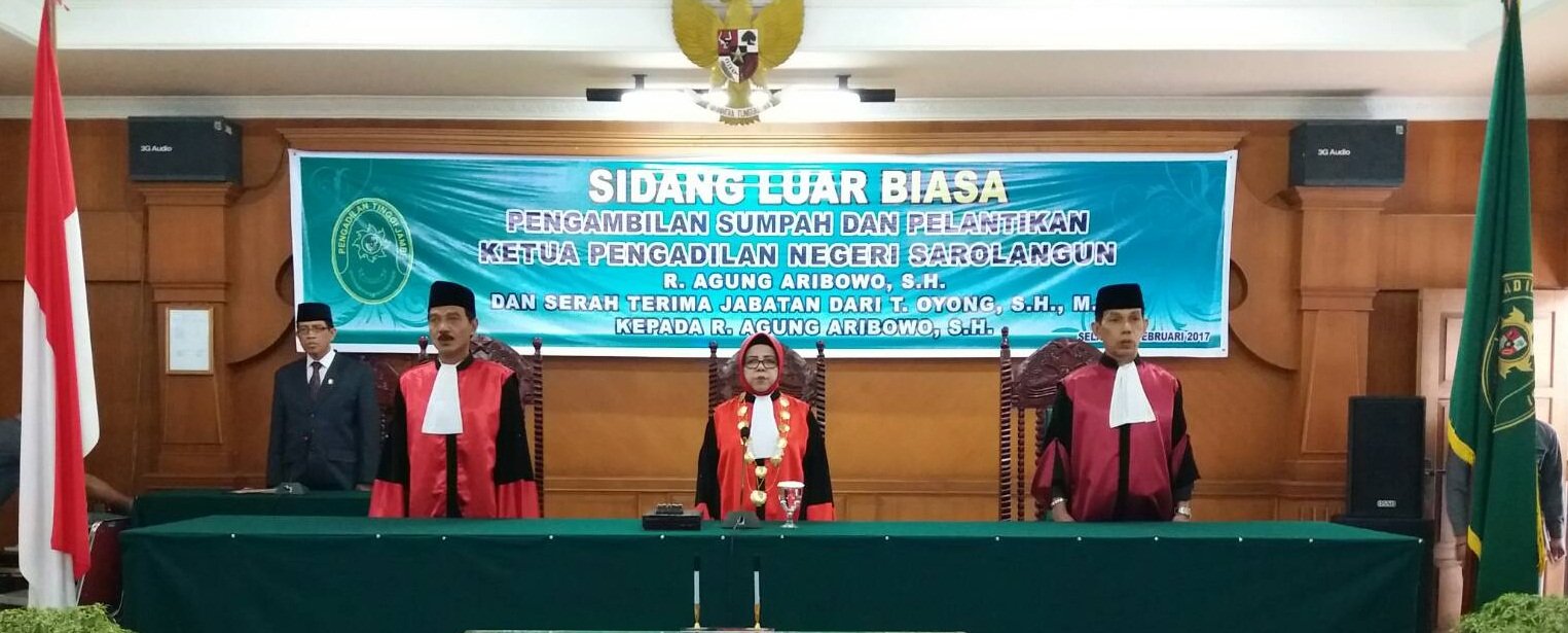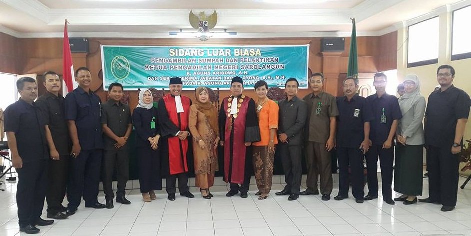 Pada Hari Selasa tanggal 07 Februari 2017. Bertempat di Ruang Aula Pengadilan Tinggi Pengadilan Tinggi Jambi dilaksanakan Sidang Luar Biasa Pengambilan Sumpah dan Pelantikan Bapak R. Agung Aribowo, S.H. sebagai Ketua Pengadilan Negeri Sarolangun yang dipimpin oleh Ketua Majelis Pengadilan Tinggi Jambi Ibu Hj. Irama Chandra Ilja, S.H.,M.H Ketua Pengadilan Tinggi Jambi didampingi oleh anggota majelis Bapak JANUARSO RAHARDJO, S.H dan Bapak AGUS JUMARDO, S.H.,M.H.