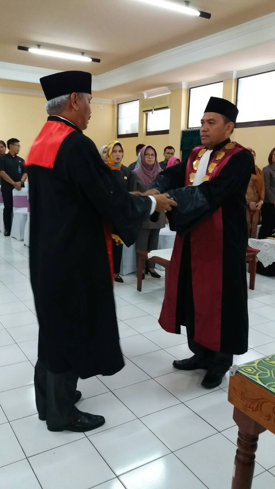 Sidang Luar Biasa Pengambilan Sumpah dan Pelantikan Ketua Pengadilan Negeri Sarolangun berlangsung khidmat dengan diawali pembacaan SK Pelantikan Ketua Pengadilan Negeri Sarolangun, pengambilan sumpah pelantikan, penyerahan kalung jabatan, penandatanganan fakta integritas, Serah Terima Jabatan Dari Bapak Tengku Oyong, S.H.,M.H Ketua Pengadilan Negeri Sarolangun yang lama Kepada Bapak R. Agung Aribowo, S.H. Ketua Pengadilan Negeri Sarolangun yang baru dan diakhiri dengan ucapan selamat dari semua tamu undangan yang ikut menghadiri sidang luar biasa tersebut.