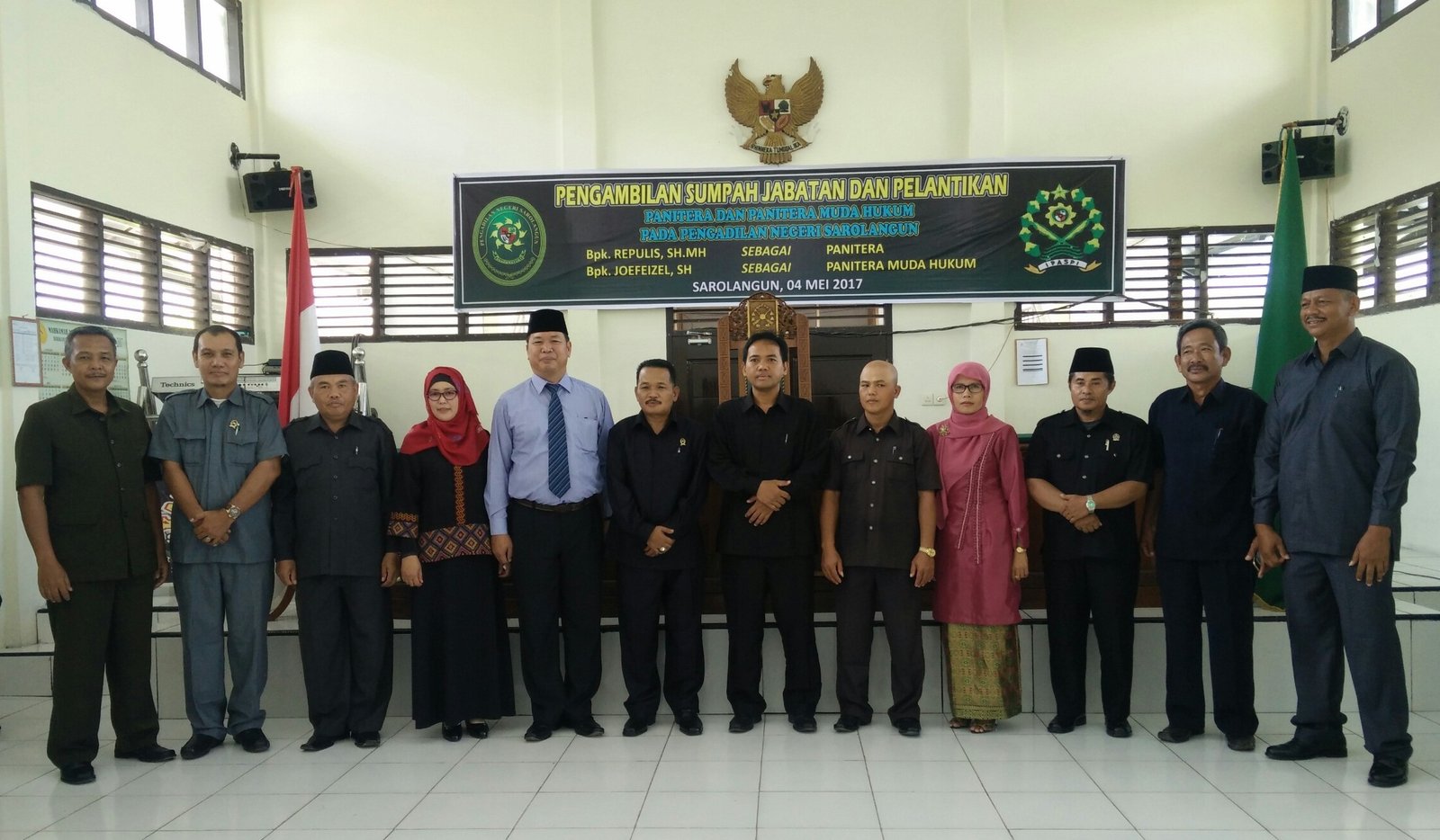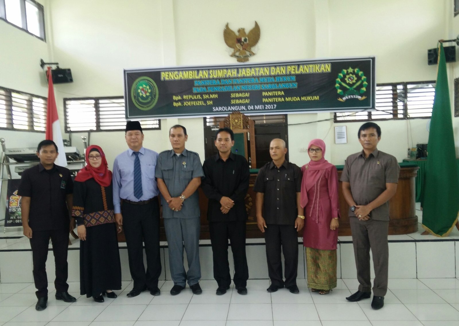 Pada Hari Kamis Tanggal 04 Mei 2017, Bertempat di Ruang Sidang Cakra Pengadilan Negeri Sarolangun, Bapak R. Agung Aribowo, S.H. Ketua Pengadilan Negeri Sarolangun melantik dan mengambil Sumpah Jabatan Bapak Repulis, S.H,.M.H sebagai Panitera Pengadilan Negeri Sarolangun yang sebelumnya menjabat sebagai Wakil Panitera di Pengadilan Negeri Kayu Agung dan Bapak Joefeizel, S.H Panitera Muda Hukum Pengadilan Negeri Sarolangun yang sebelumnya menjabat sebagai Panitera Pengganti di Pengadilan Negeri Sungai Penuh.