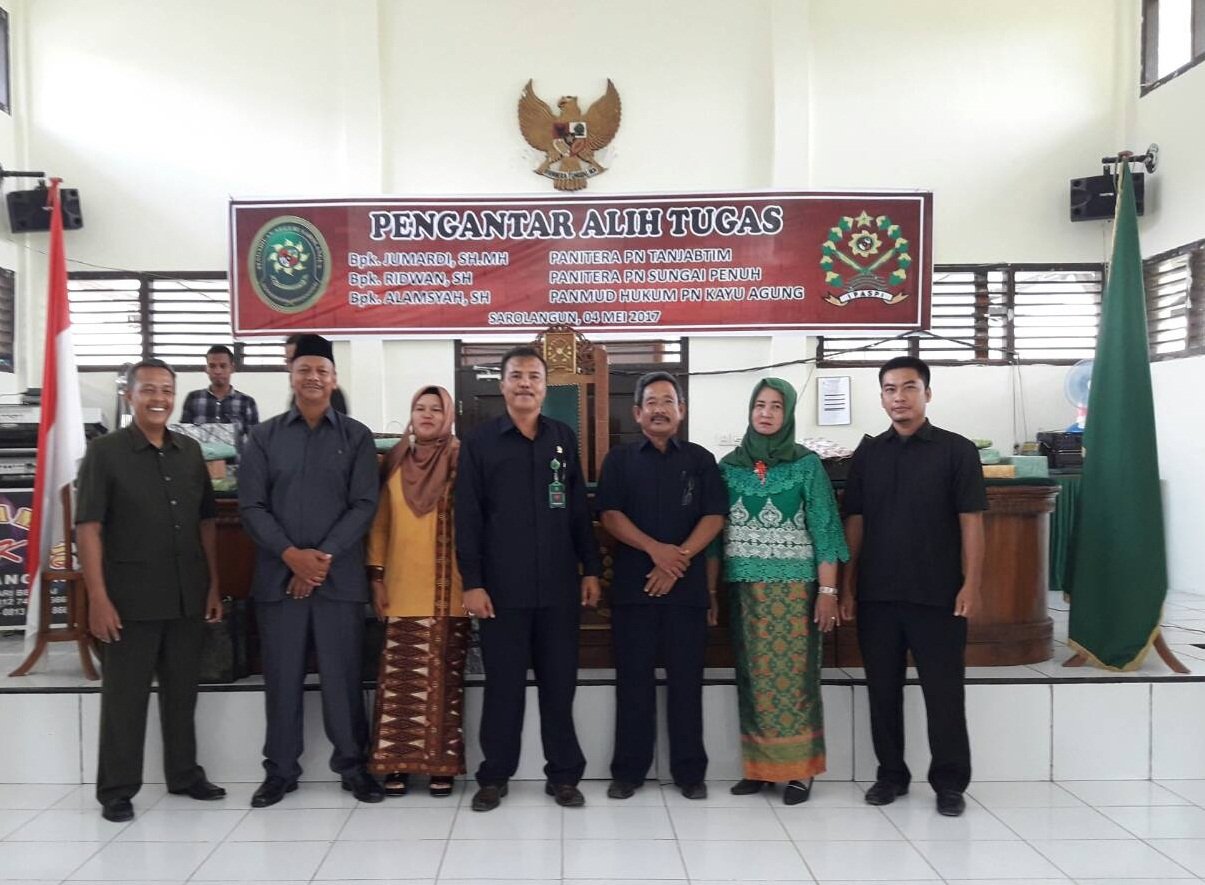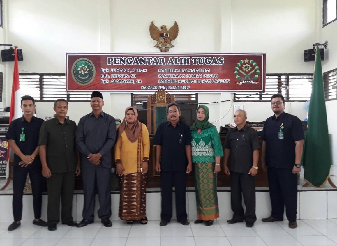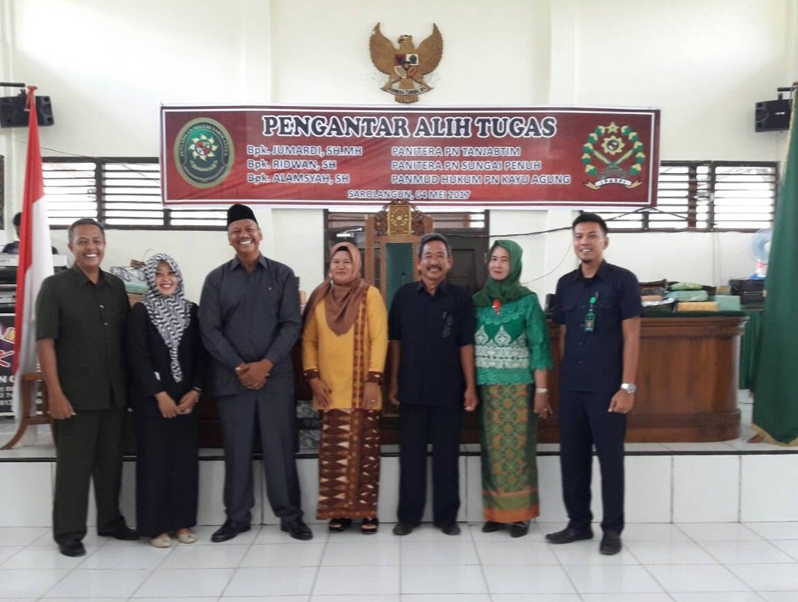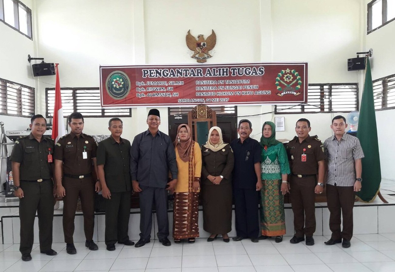 Pada Hari Kamis Tanggal 04 Mei 2017, Bertempat di Ruang Sidang Cakra Pengadilan Negeri Sarolangun, seluruh keluarga besar Pengadilan Negeri Sarolangun mengadakan acara Pengantar Alih Tugas Bapak Jumardi, SH,.MH, Panitera Pengadilan Negeri Sarolangun menjadi Panitera Pengadilan Negeri Tanjung Jabung Timur, Bapak Ridwan, SH dari Wakil Panitera Pengadilan Negeri Sarolangun menjadi Panitera Pengadilan Negeri Sungai Penuh dan Bapak Alamsyah, SH dari Panitera Muda Hukum Pengadilan Negeri Sarolangun menjadi Panitera Hukum Pengadilan Negeri Kayu Agung.