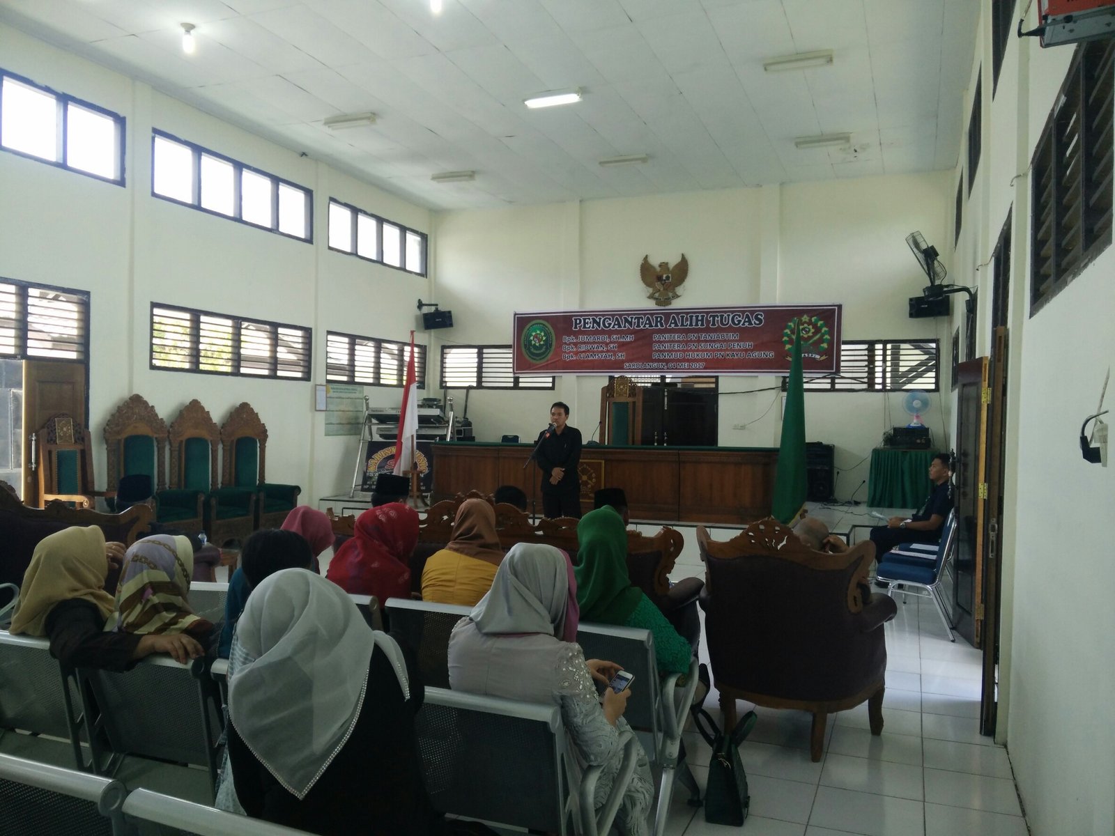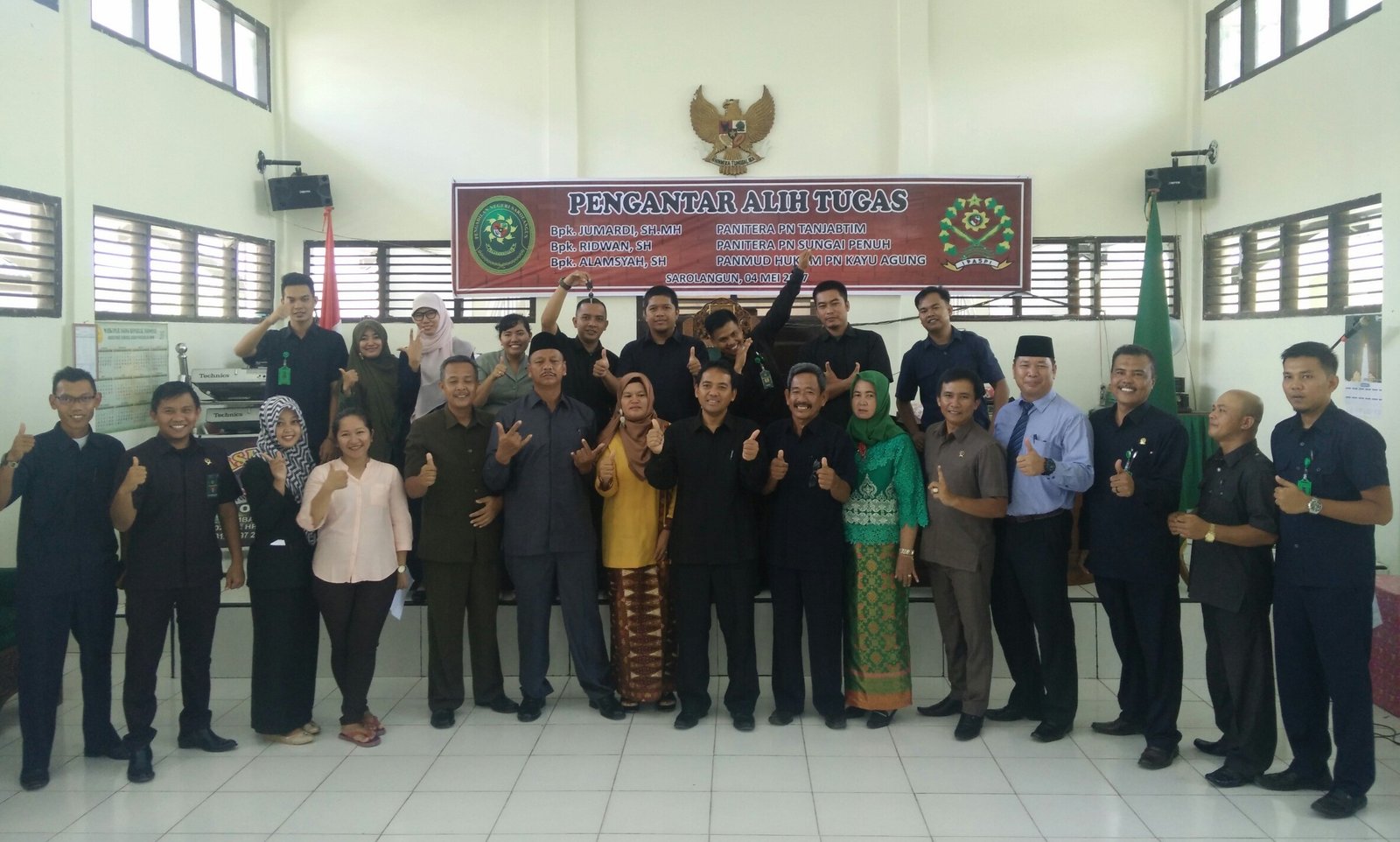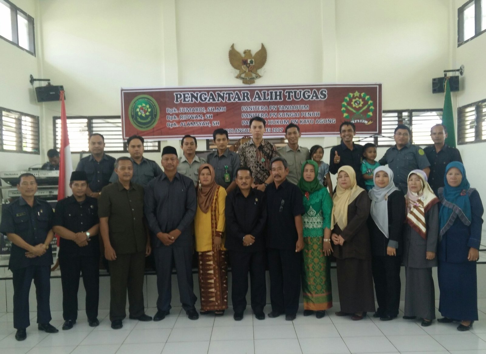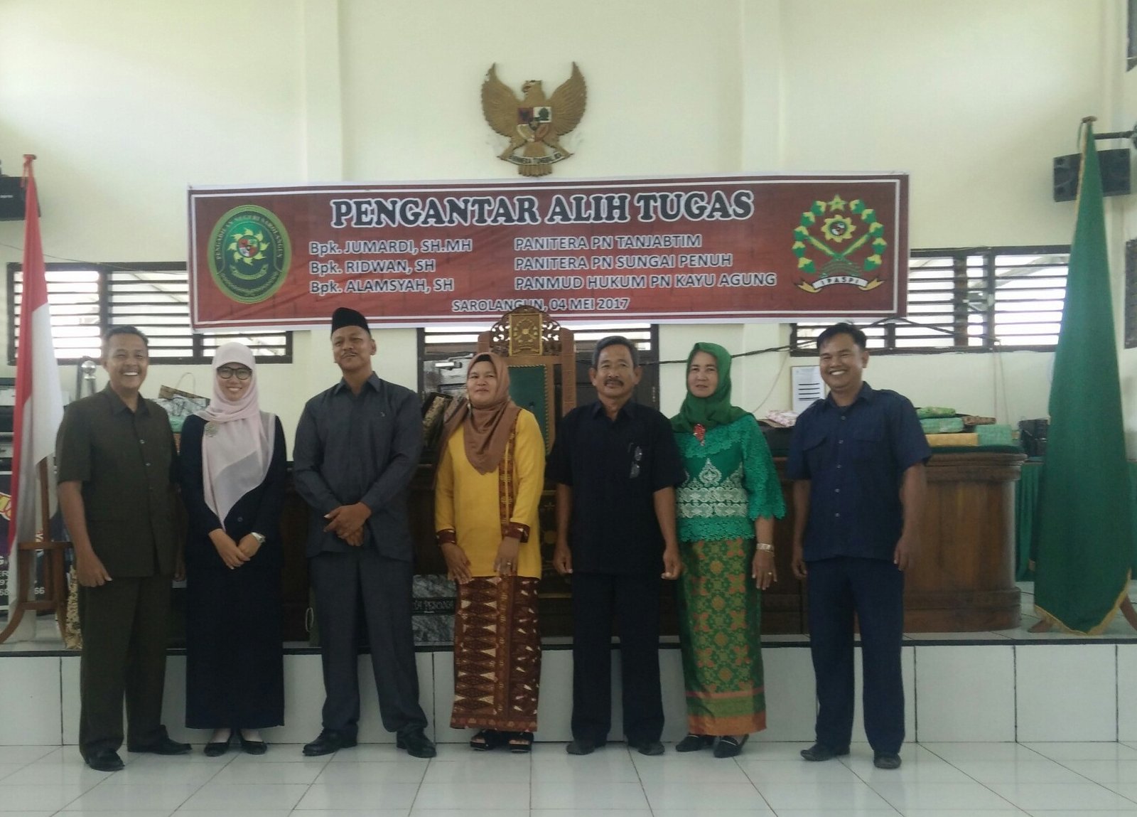 Pada Hari Kamis Tanggal 04 Mei 2017, Bertempat di Ruang Sidang Cakra Pengadilan Negeri Sarolangun, seluruh keluarga besar Pengadilan Negeri Sarolangun mengadakan acara Pengantar Alih Tugas Bapak Jumardi, SH,.MH, Panitera Pengadilan Negeri Sarolangun menjadi Panitera Pengadilan Negeri Tanjung Jabung Timur, Bapak Ridwan, SH dari Wakil Panitera Pengadilan Negeri Sarolangun menjadi Panitera Pengadilan Negeri Sungai Penuh dan Bapak Alamsyah, SH dari Panitera Muda Hukum Pengadilan Negeri Sarolangun menjadi Panitera Hukum Pengadilan Negeri Kayu Agung.