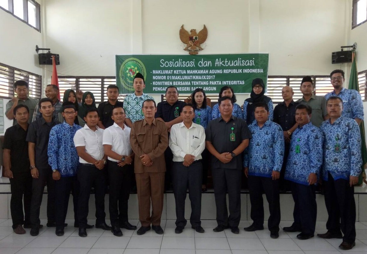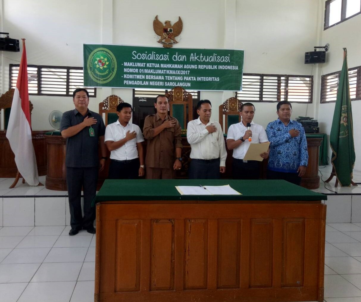 Hari Senin tanggal 02 Oktober 2017 Bertempat diruang Cakra Pengadilan Negeri Sarolangun, Sosialisasi dan Aktualisasi Maklumat Ketua Mahkamah Agung RI Nomor : 01/Maklumat/KMA/IX/2017 dan Komitmen Bersama tentang Fakta Integritas Pengadilan Negeri Sarolangun yang di pimpin oleh Bapak R. Agung Aribowo, SH Ketua Pengadilan Negeri Sarolangun Diikuti oleh Ketua, Wakil Ketua, Para Hakim, Panitera, Sekretaris, Pejabat Fungsional, Pejabat Struktural, Panitera Pengganti, Juru Sita Pengganti serta Staf pegawai dan Honorer Pengadilan Negeri Sarolangun.