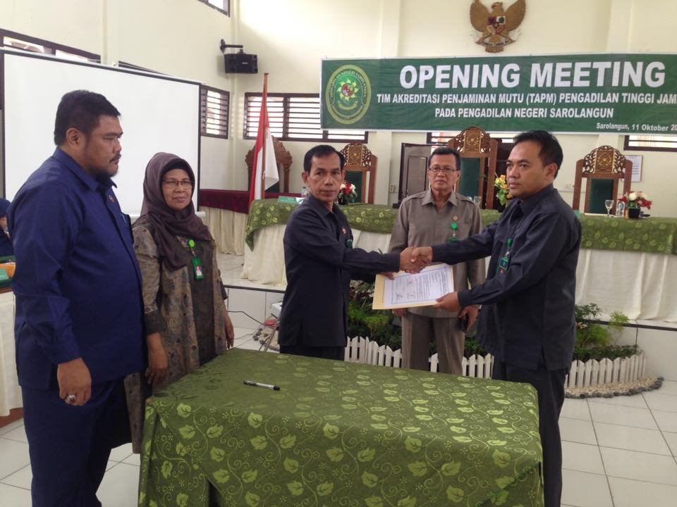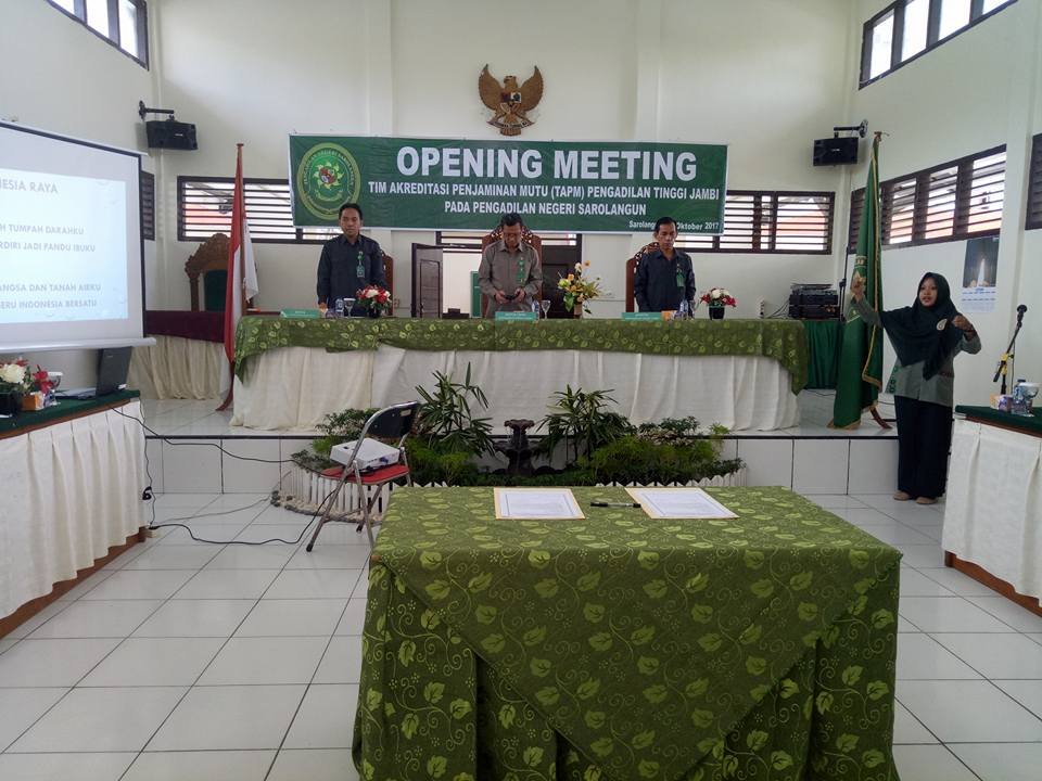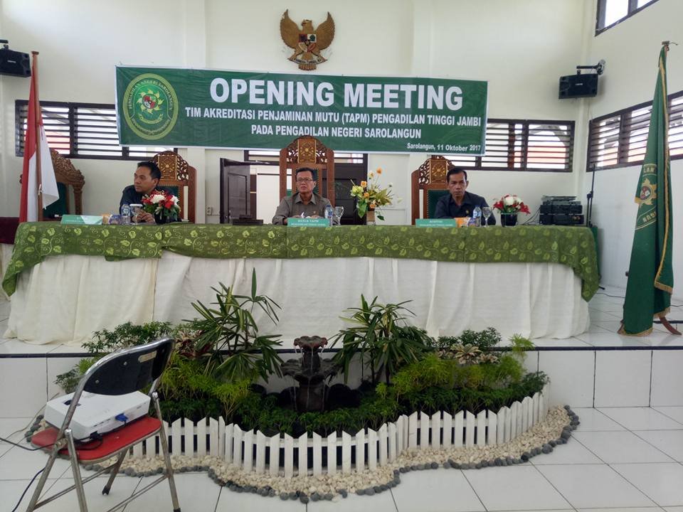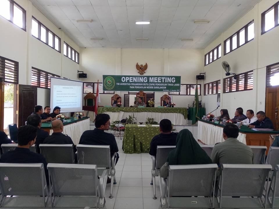Hari Rabu tanggal 11 Oktober 2017 Bertempat di Pengadilan Negeri Sarolangun, Kedatangan Tim Akreditasi Penjaminan Mutu (TAPM) Pengadilan Tinggi Jambi di sambut oleh Bapak R. Agung Aribowo, SH Ketua Pengadilan Negeri Sarolangun Beserta Seluruh Keluarga Besar Pengadilan Negeri Sarolangun, Adapun tujuan Tim ini selain untuk melakukan proses audit terhadap Standar Akreditasi Penjaminan Mutu Pengadian Negeri Sarolangun di wilayah Pengadilan Tinggi Jambi.