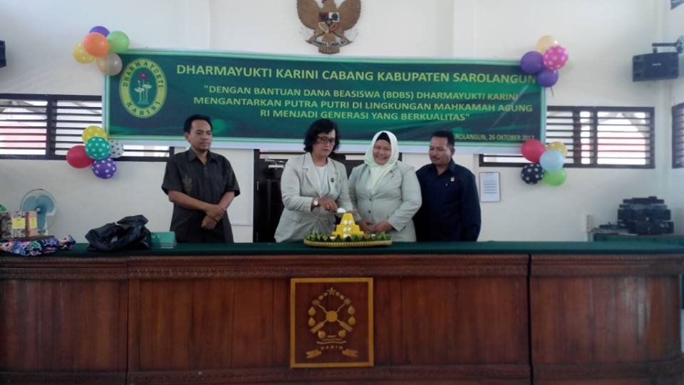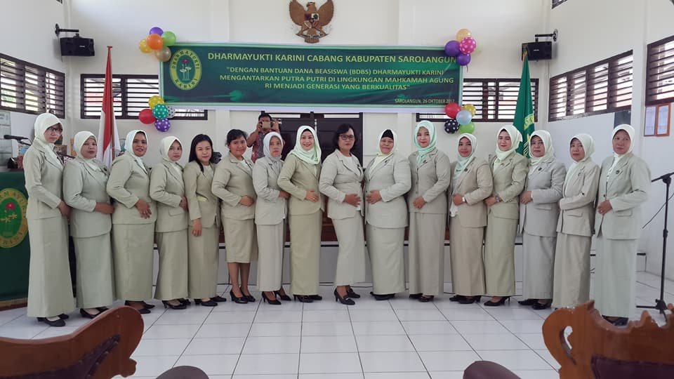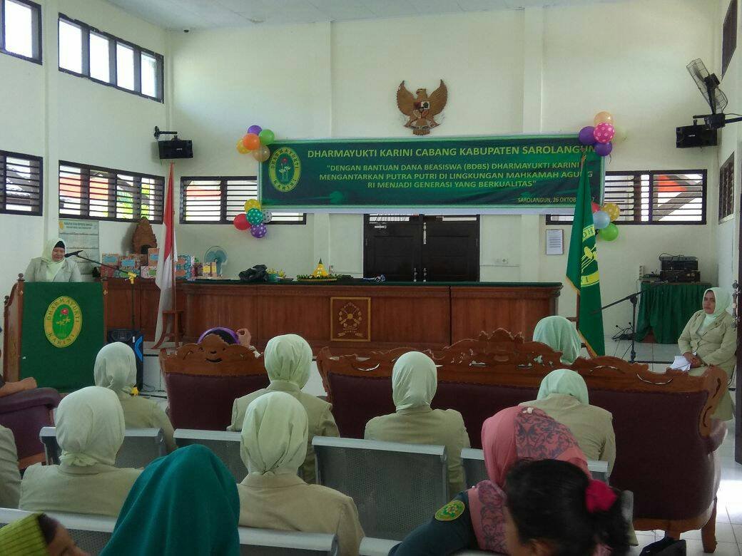 Selanjutnya acara berikutnya Dharmayukti Karini Cabang Sarolangun mengadakan acara Penyerahan Bantuan Dana Beasiswa (BDBS) di ruang sidang Cakra Pengadilan Negeri Sarolangun, Dengan Bantuan Dana Beasiswa (BDBS) Dharmayukti Karini Mengantarkan Putra Putri Di Lingkungan Mahkamah Agung RI Menjadi Generasi Yang Berkualitas".