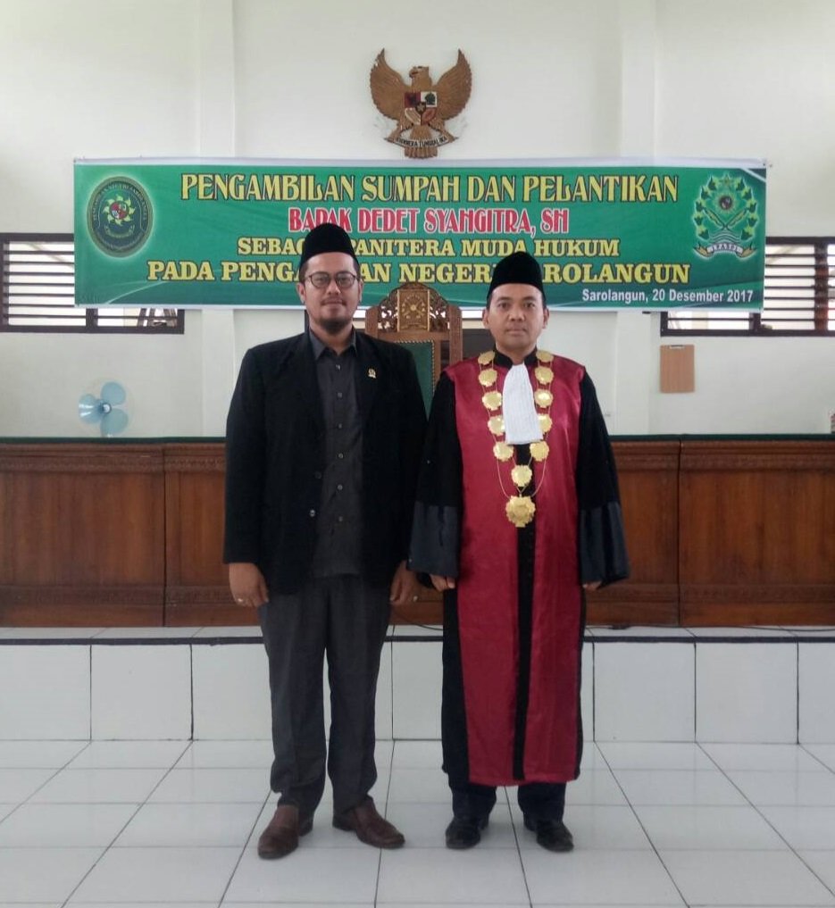 Pada Hari Rabu Tanggal 20 Desember 2017, Bertempat di Ruang Sidang Cakra Pengadilan Negeri Sarolangun, Bapak R. Agung Aribowo, S.H. Ketua Pengadilan Negeri Sarolangun melantik dan mengambil Sumpah Jabatan Bapak Dedet Syahgitra, S.H, sebagai Panitera Muda Hukum Pengadilan Negeri Sarolangun yang sebelumnya menjabat sebagai Panitera Pengganti di Pengadilan Negeri Sarolangun.