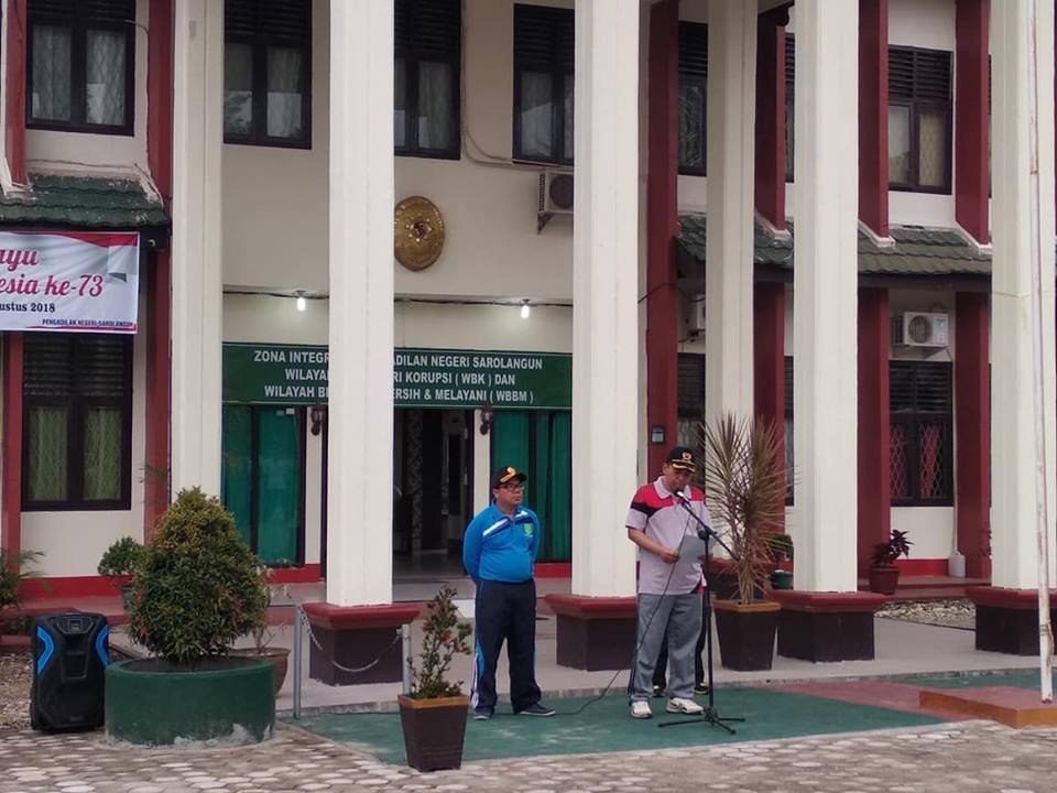 Pada hariMinggu tanggal 19 Agustus 2017 Bertempat di halaman depan kantor Pengadilan Negeri Sarolangun, Upacara Gabungan Pengadilan Negeri Sarolangun dan Pengadilan Agama Sarolangun untuk memperingati hari ulang tahun Mahkamah Agung Republik Indonesia yang ke-73, yang bertindak sebagai pembina upacara yaitu Ketua Pengadilan Negeri Sarolangun Bapak R. Agung Aribowo, SH. Upacara diikuti oleh para Hakim, Panitera, Sekretaris, Pejabat struktural maupun Fungsional, Staf Pegawai dan Honorer PN dan PA Sarolangun.