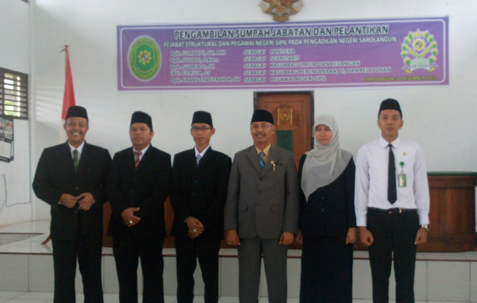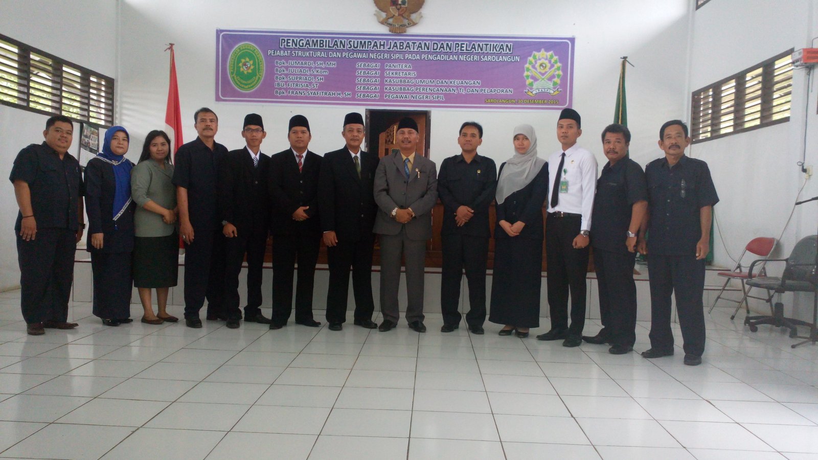 30 Desember 2016, Bertempat di Ruang Sidang Utama Pengadilan Negeri Sarolangun, Bpk. Tengku Oyong, S.H.,M.H Ketua Pengadilan Negeri Sarolangun melantik dan mengambil Sumpah Jabatan terlampir nama - nama pejabat yang di lantik sebagai berikut :