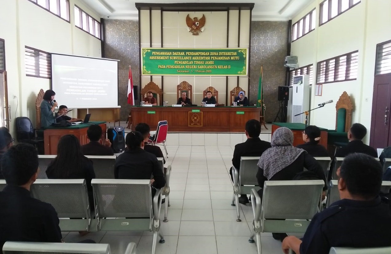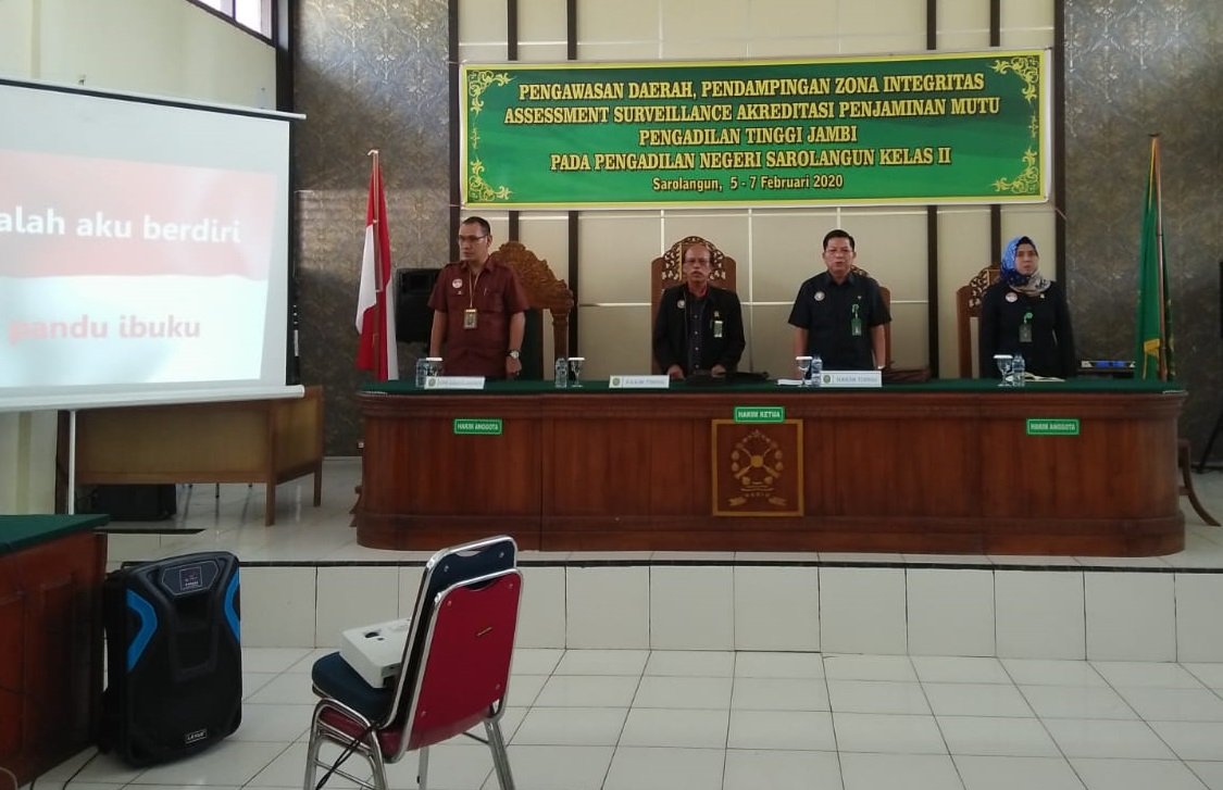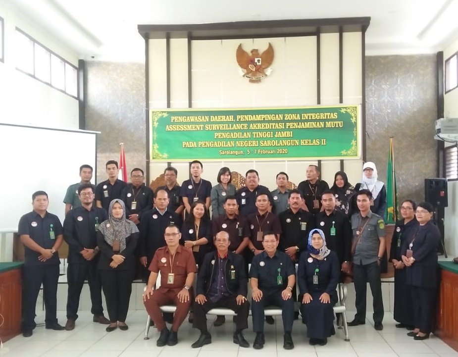 Pada hari Senin tanggal 05 Februari 2020, Bertempat di ruang Sidang Cakra Pengadilan Negeri Sarolangun, Kedatangan Tim Pengawasan Daerah dan Pendampingan Zona Integritas Assesment Surveillance Akreditasi Penjaminan Mutu PT Jambi Pada PN Sarolangun Kelas II ini dipimpin oleh Bapak John Diamond Tambunan, S.H.,M.H. (Hakim Tinggi/Ketua Tim), Bapak Dr. Kasianus Telaumbanua, S.H., M.H (Hakim Tinggi/Penilai), Bapak Kurniawan Anshory, S.Si.,MH. (Kabag Umum dan Keuangan PT Jambi) Beserta Panitera Pengganti dan Staf Pengadilan Tinggi Jambi, langsung di sambut oleh Bapak Phillip Mark Soentpiet, S.H.,M.H. Ketua Pengadilan Negeri Sarolangun Beserta Seluruh Keluarga Besar Pengadilan Negeri Sarolangun,