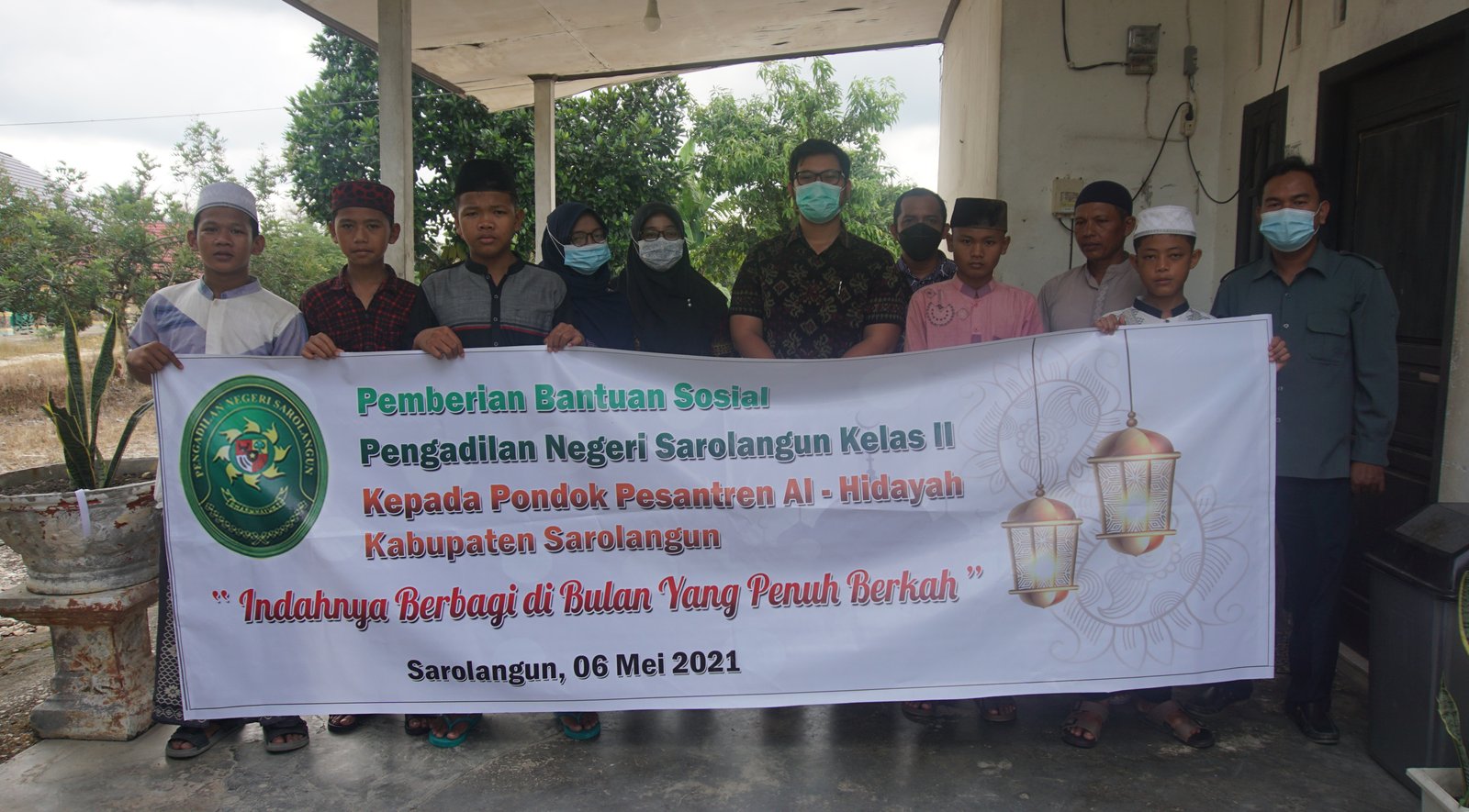 Pada hari Kamis, 06 Mei 2021, Keluarga Besar Pengadilan Negeri Sarolangun mengadakan Pemberian Bantuan Sosial kepada Pondok Pesantren Al-Hidayah dan Panti Asuhan Muahammadiyah Kabupaten Sarolangun. Acara Pemberian Bantuan Sosial ini dipimpin oleh Wakil Ketua Pengadilan Negeri Sarolangun, bersama para Hakim dan Staf Pegawai PNS Pengadilan Negeri Sarolangun.