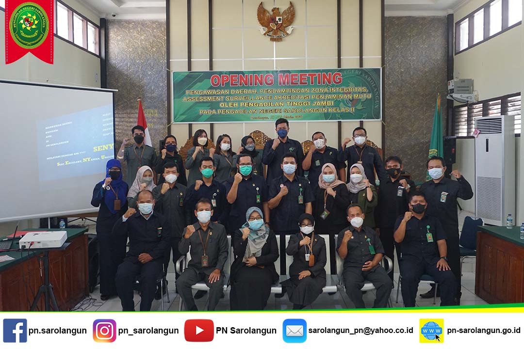 Pada hari Rabu, tanggal 27 Oktober 2021, Bertempat di ruang sidang telah dilaksanakan Opening Meeting Pengawasan Daerah, Pendampingan Zona Integritas, Assesment Surveillance Akreditasi Penjaminan Mutu oleh Pengadilan Tinggi Jambi pada Pengadilan Negeri Sarolangun. Pada kesempatan