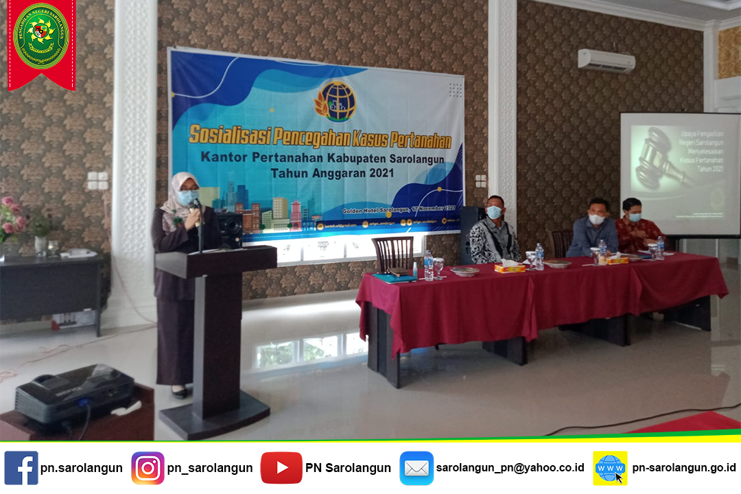 Rabu, 17 November 2021 - Bertempat di Kantor Pertanahan Kabupaten Sarolangun, Ibu Wakil Ketua Pengadilan Negeri Sarolangun, Ibu Deka Diana, S.H., M.H. menghadiri undangan acara Sosialisasi Pencegahan Kasus Pertanahan. Pada kesempatan ini,