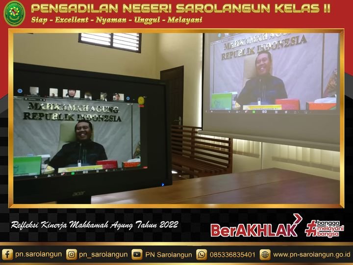 Rabu, 29 Desember 2021 - Bertempat di ruang sidang cakra Pengadilan Negeri Sarolangun segenap ASN yang terdiri dari Ibu Wakil Ketua Pengadilan Negeri Sarolangun, Sekretaris, Para Hakim dan Kepala Sub Bagian, mengikuti acara siaran langsung Refleksi Akhir Tahun 2021 Mahkamah Agung dengan tema