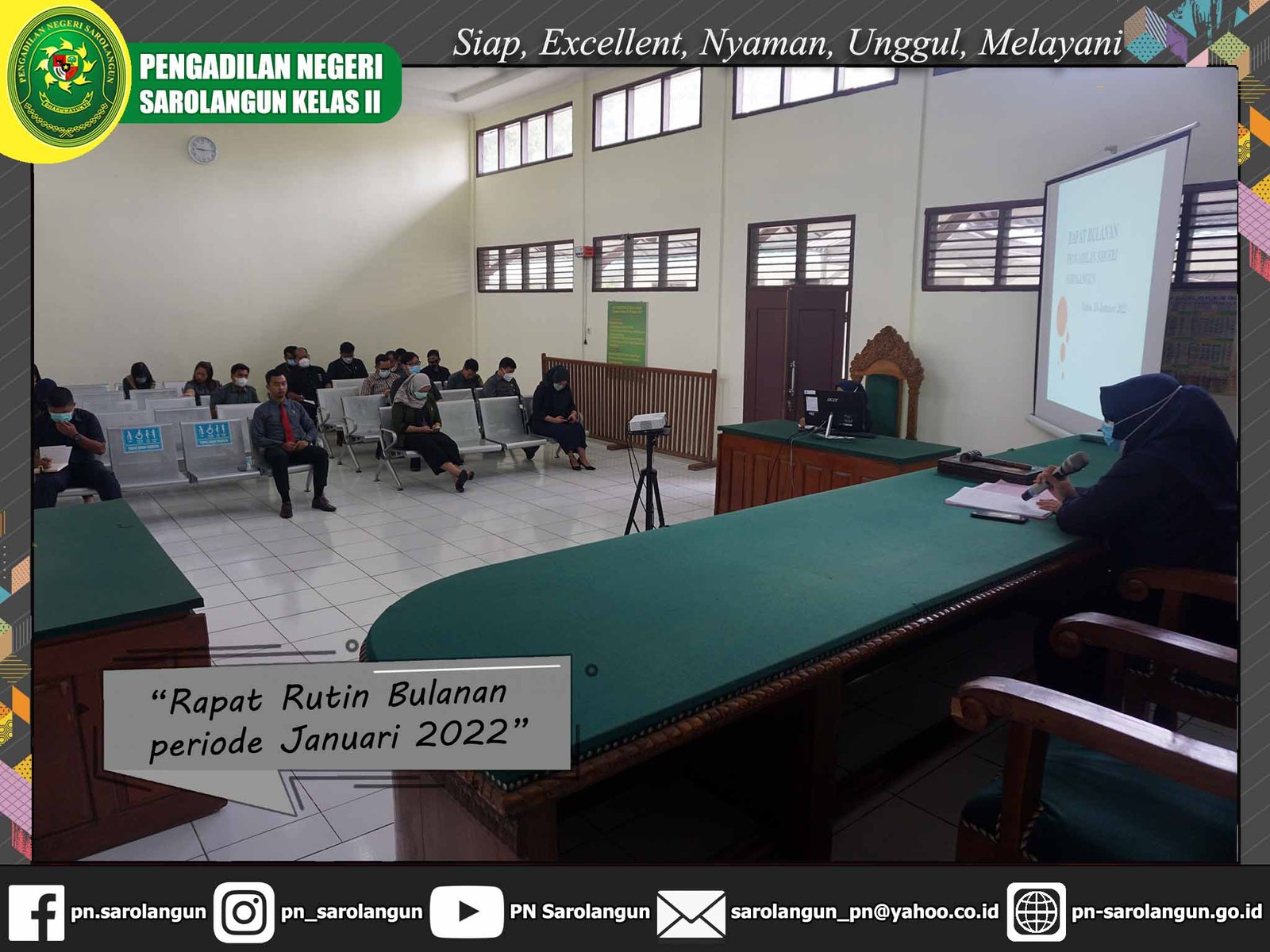 Rabu, 19 Januari 2022 - Bertempat di ruang sidang Chakra Pengadilan Negeri Sarolangun telah dilaksanakan Rapat Rutin Bulanan untuk bulan Januari 2022. Rapat ini dipimpin oleh Wakil Ketua Pengadilan Negeri Sarolangun, Ibu Deka Diana, S.H., M.H. Rapat dihadiri oleh Panitera, Sekretaris, Para Hakim, Pejabat Struktural dan Fungsional, serta Staf.