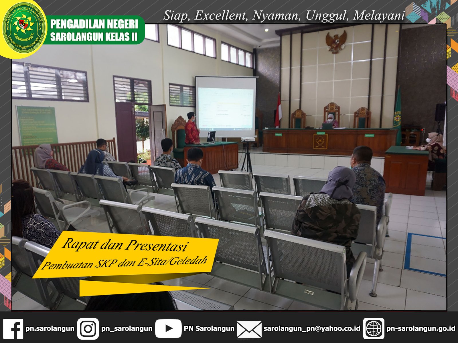 Kamis, 20 Januari 2022 - Bertempat di ruang sidang Chakra Pengadilan Negeri Sarolangun telah dilaksanakan rapat dan presentasi pembuatan SKB dan aplikasi E-Sita/Geledah. Tampil sebagai presentator untuk pembuatan SKP Hakim, yaitu Hakim PN Sarolangun, Bapak Dzakky Hussein, S.H. Selanjutnya, yang mempresentasikan pembuatan SKP untuk bagian Kesekretariatan yaitu Sekretaris PN Sarolangun, Bapak Juliadi, S.Kom.