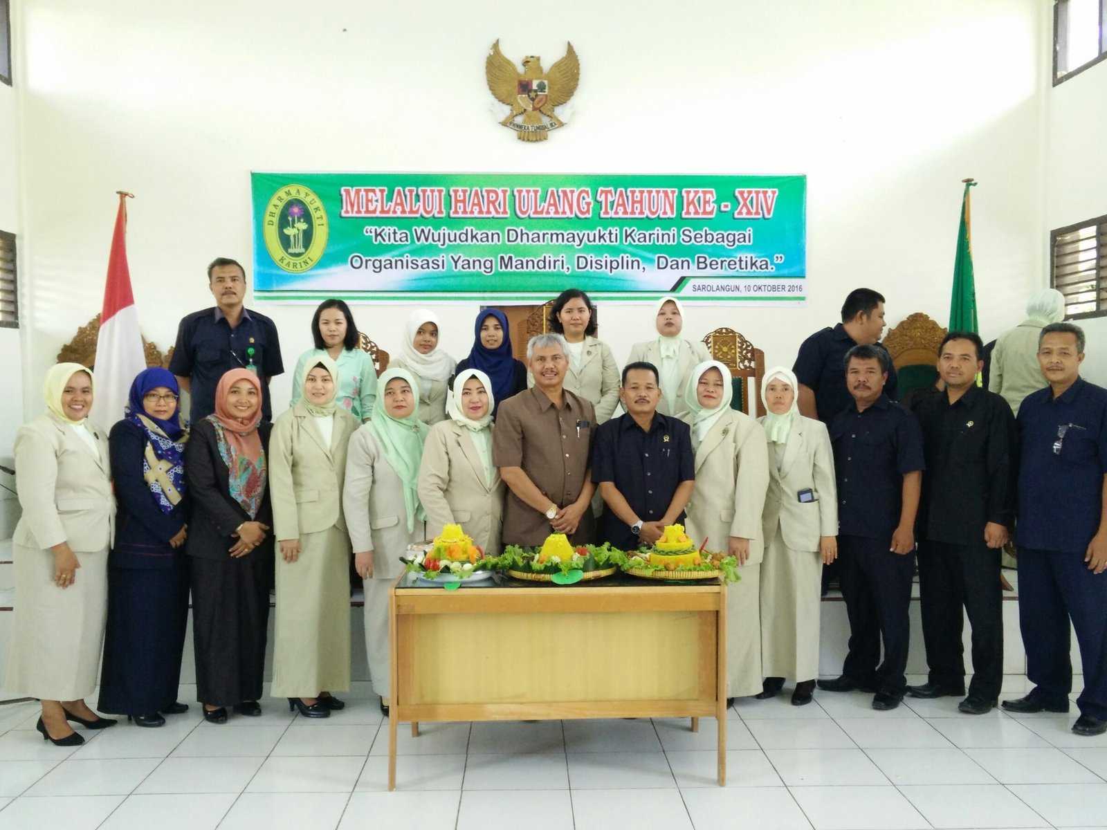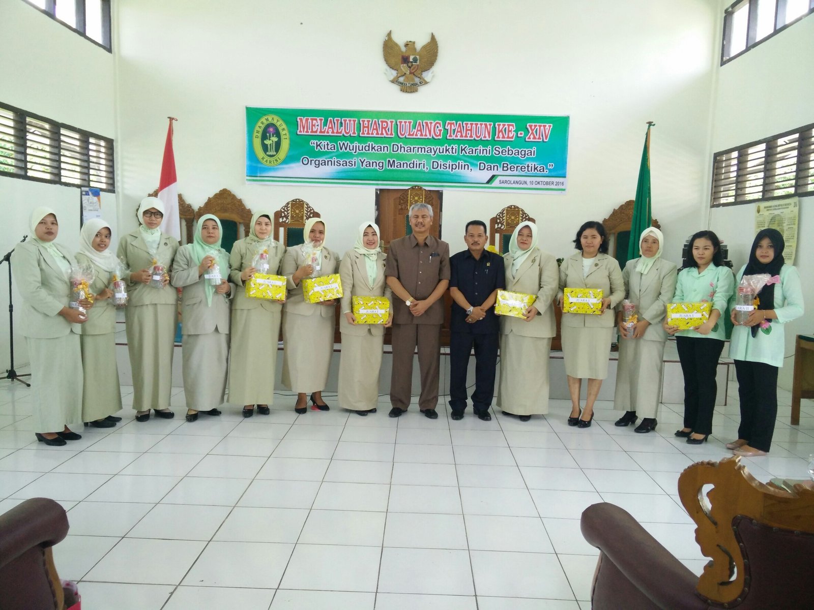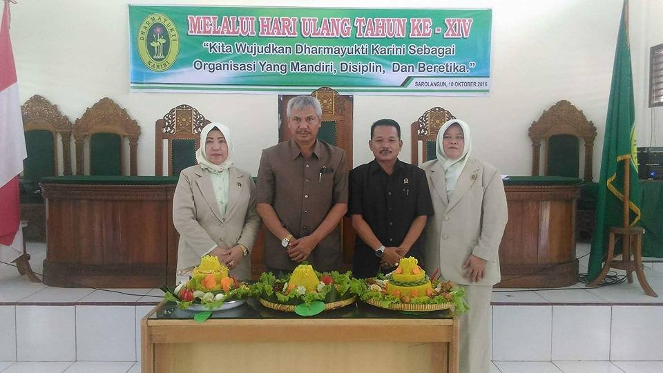 Dengan tema “Kita Wujudkan Dharmayukti Karini Sebagai Organisasi Yang Mandiri, Disiplin dan Beretika." melaui HUT Dharamayukti Karini ke XIV Cabang Kabupaten Sarolangun, terselenggara dengan sukses dan meriah, bertempat di ruang sidang Pengadilan Negeri Sarolangun. Acara ini dihadiri oleh Keluarga Besar dari Pengadilan Negeri Sarolangun dan Pengadilan Agama Sarolangun,