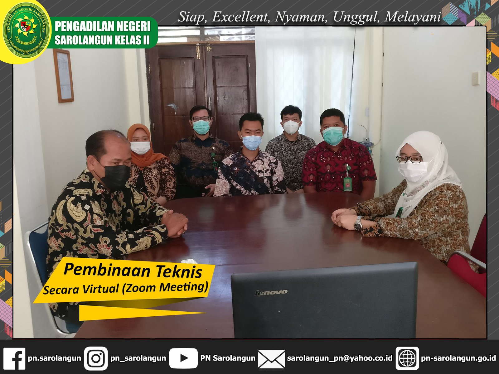 Kamis, 27 Januari 2022 - Bertempat di ruang mediasi Pengadilan Negeri Sarolangun, Wakil Ketua, Para Hakim, Panitera, dan Sekretaris Pengadilan Negeri Sarolangun menghadiri undangan Pembinaan Teknis Secara Virtual oelh Pimpinan Mahkamah Agung RI. Pembinaan teknis ini akan berlangsung selama dua hari, dan materi pada hari pertama ini, Kamis 27 januari 2022, adalah pembinaan bidang teknis dan administrasi yudisial oleh Pimpinan Mahkamah Agung. Dan materi untuk besok hari, 28 januari 2022, adalah pembinaan bidang teknis dan yudisial oleh Pejabat Eselon I Mahkamah Agung RI.