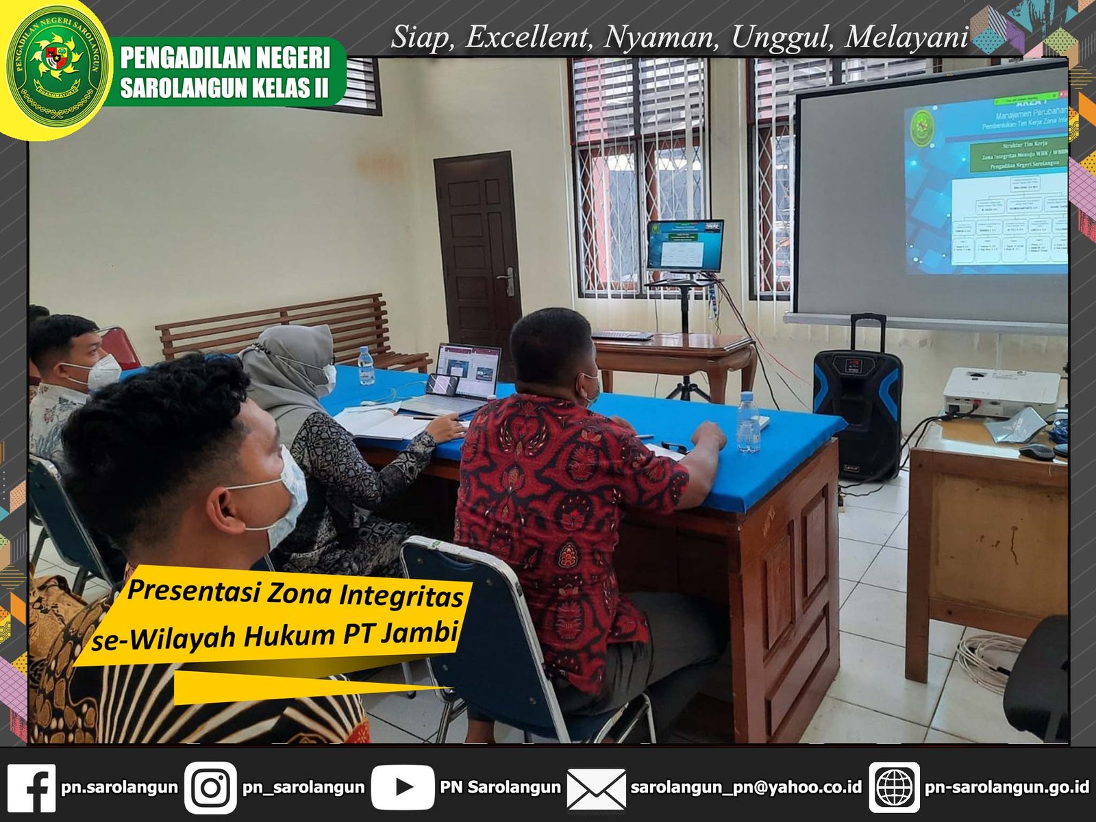 Kamis, 03 Februari 2022 - Bertempat di Ruang Sidang Anak Pengadilan Negeri Sarolangun, telah dilaksanakan Presentasi Zona Integritas. Pelaksanaan presentasi Zona Integritas ini sehubungan dengan Surat dari Direktorat Jenderal Badan Peradilan Umum Mahkamah Agung Republik Indonesia, Nomor : 1256/DJU/OT.01.2/12/2021, tanggal 7 Desember 2021, tentang Penyampaian Data untuk Penerapan Zona Integritas tahun 2022. Dan Surat Pengadilan Tinggi Jambi, Nomor : W5-U/297/Kp.01.1/1/2022, tanggal, 28 Januari 2022, perihal Undangan Presentasi Zona Integritas. Ibu Wakil Ketua Pengadilan Negeri Sarolangun, Deka Diana, S.H., M.H. bertindak sebagai presentator dalam kegiatan presentasi Penerapan Zona Integritas Tahun 2022 ini.