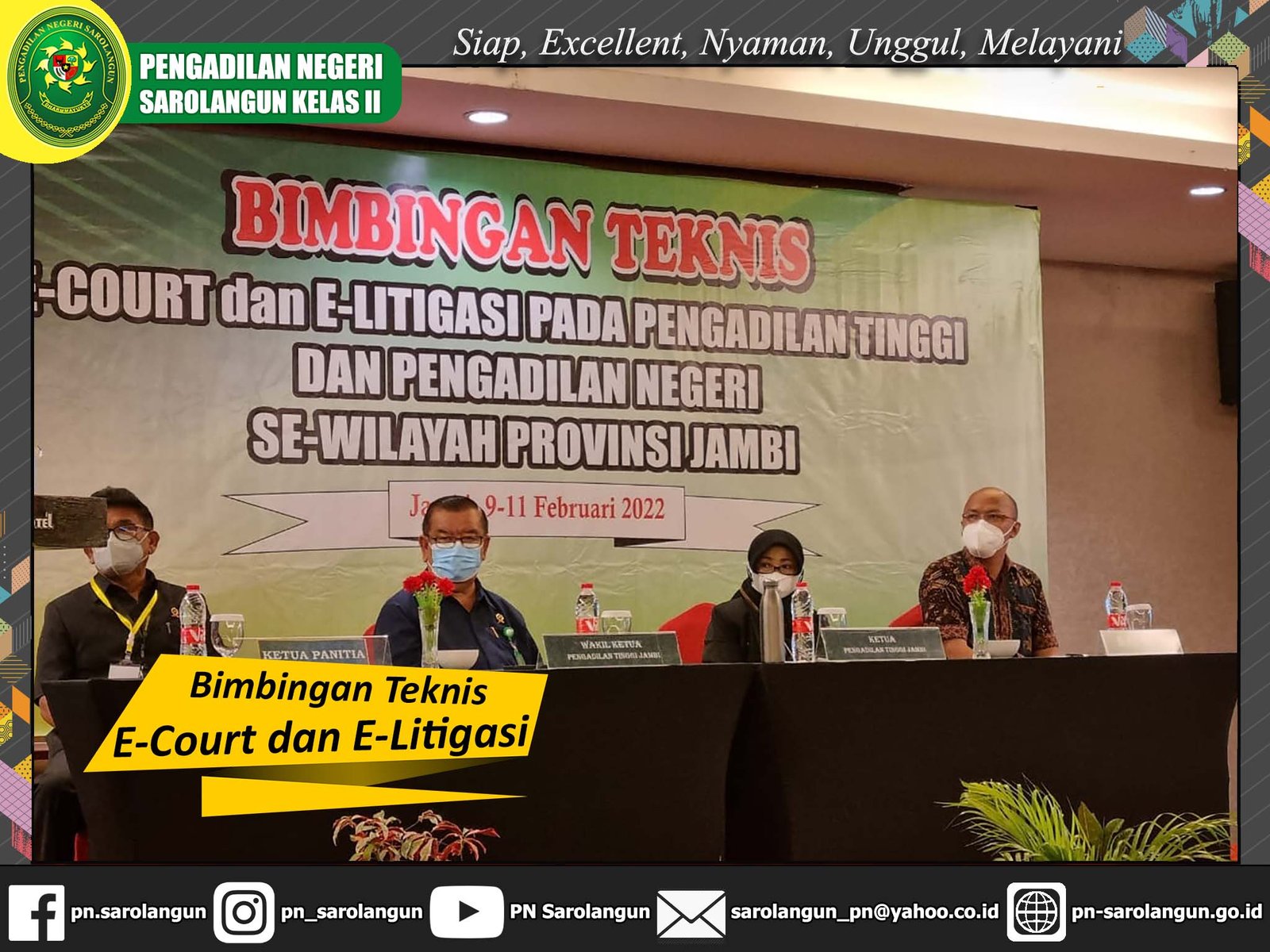 Rabu, 09 Februari 2022 - Wakil Ketua Pengadilan Negeri Sarolangun, Ibu Deka Diana, S.H., M.H. dan Panitera Pengadilan Negeri Sarolangun, Muhammad Soleh, S.H. mengikuti kegiatan Bimbingan Teknis E-Court dan E-Litigasi pada Pengadilan Tinggi dan Pengadilan Negeri Se-Wilayah Provinsi Jambi yang dilaksanakan di Jambi.