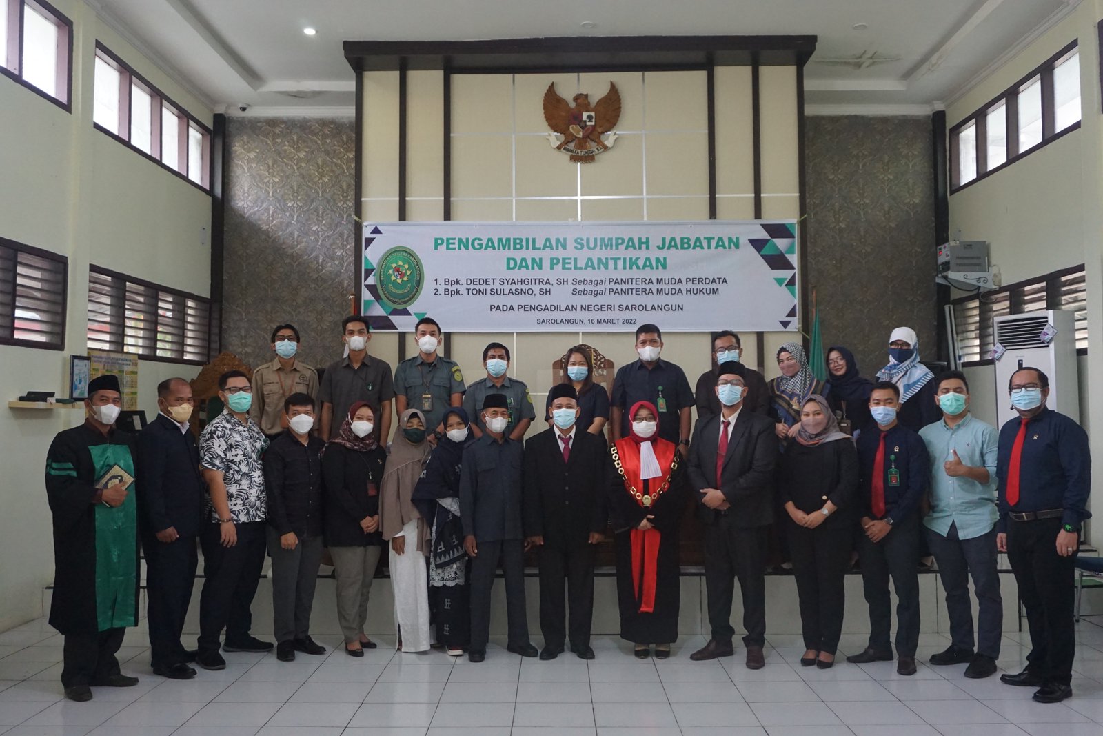 Pada hari Selasa tanggal 14 Maret 2022, Bertempat di Ruang Sidang Cakra Pengadilan Negeri Sarolangun, Ibu Deka Diana, S.H.,M.H. Ketua Pengadilan Negeri Sarolangun Pengambilan Sumpah Jabatan dan Pelantikan Bapak Dedet Syahgitra, SH sebagai Panitera Muda Perdata dan pada Pengadilan Negeri Sarolangun yang sebelumnya menjabat sebagai Panitera Muda Hukum di Pengadilan Negeri Sarolangun dan Bapak Toni Sulasno, SH. sebagai Panitera Muda Hukum yang sebelumnya menjabat sebagai Panitera Pengganti di Pengadilan Negeri Muara Bungo, dilanjutkan dengan dibacakannya Surat Keputusan Ketua Mahkamah Agung RI oleh Ibu Rizky Madya Wulan, S.T., M.E. Staf Sub Bagian Kepegawaian, Organisasi & Tata Laksana Pengadilan Negeri Sarolangun.