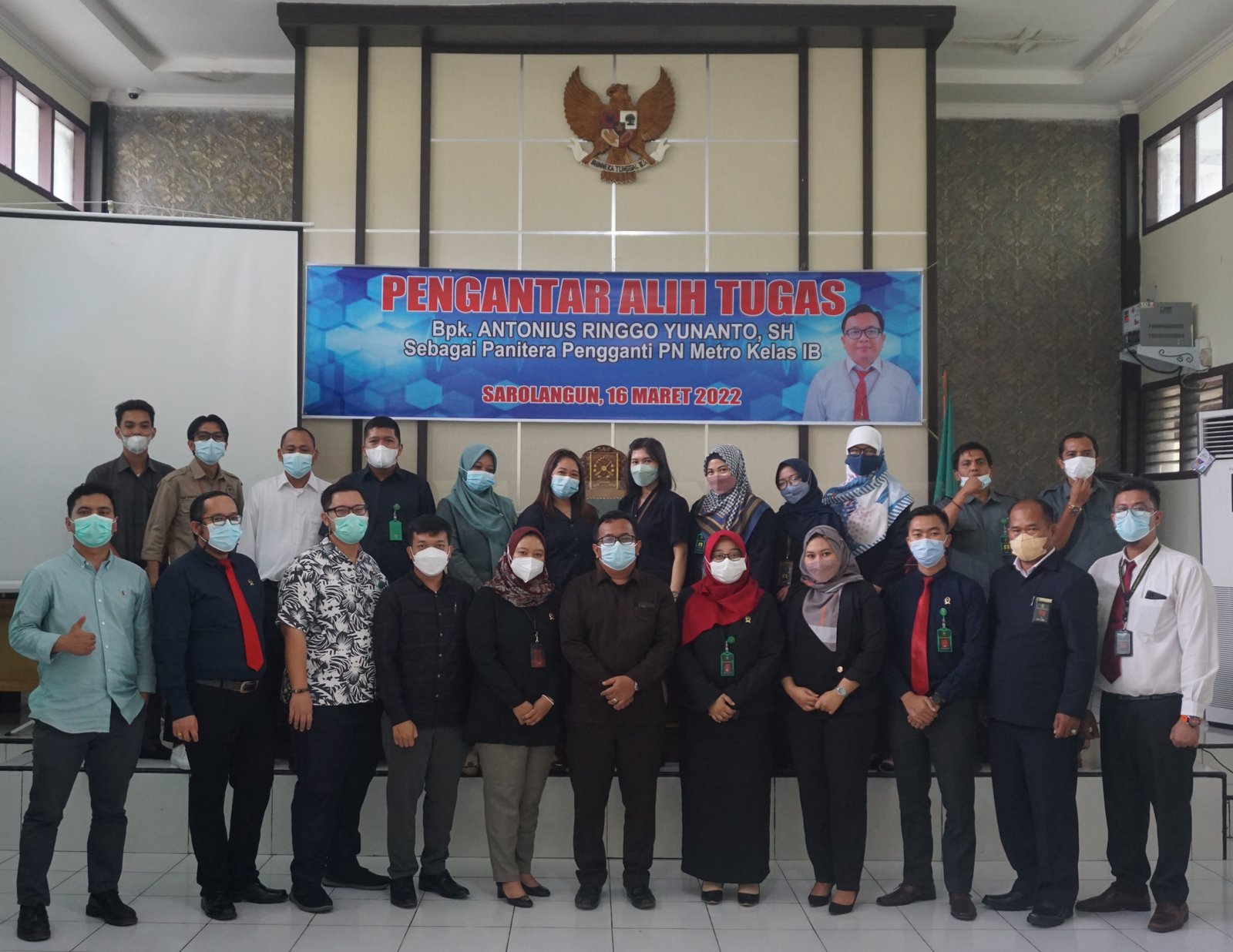 Pada hari Senin, tanggal 08 Februari 2021, bertempat di Ruang Sidang Cakra Pengadilan Negeri Sarolangun, berlangsung acara Pengantar Alih Tugas Panitera Muda Pidana, Bapak Antonius Ringgo Yunanto, S.H. dari Penitera Muda Pidana Pengadilan Negeri Sarolangun menjadi Panitera Pengganti Pengadilan Negeri Metro Kelas I B.acara tersebut diikuti oleh Ketua, para Hakim, Panitera, Sekretaris, Pejabat Struktural, Pejabat Fungsional, Staf Pegawai PNS dan Honorer PPNPN Pengadilan Negeri Sarolangun.