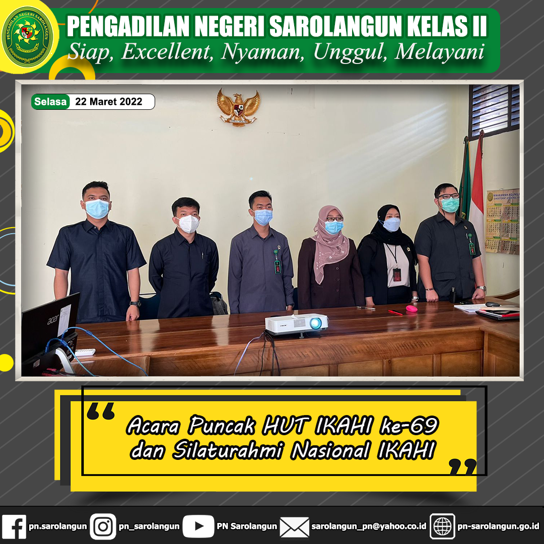 Pada hari Selasa tanggal 22 Maret 2022, bertempat di ruang Sidang Anak Pengadilan Negeri Sarolangun, Ketua Pengadilan Negeri Sasrolangun bersama seluruh para Hakim-hakim memenuhi Undangan Dalam Rangka memperingati HUT Ikatan Hakim Indonesia (IKAHI) ke-69 tahun 2022, dengan tema Sinergitas Ikahi Mendukung Akselerasi Terwujudnya Peradilan Modern. Kegiatan puncak HUT IKAHI dan Silahturrahmi Nasional IKAHI secara virtual/Zoom Meeting di Pengadilan Negeri Sarolangun.
