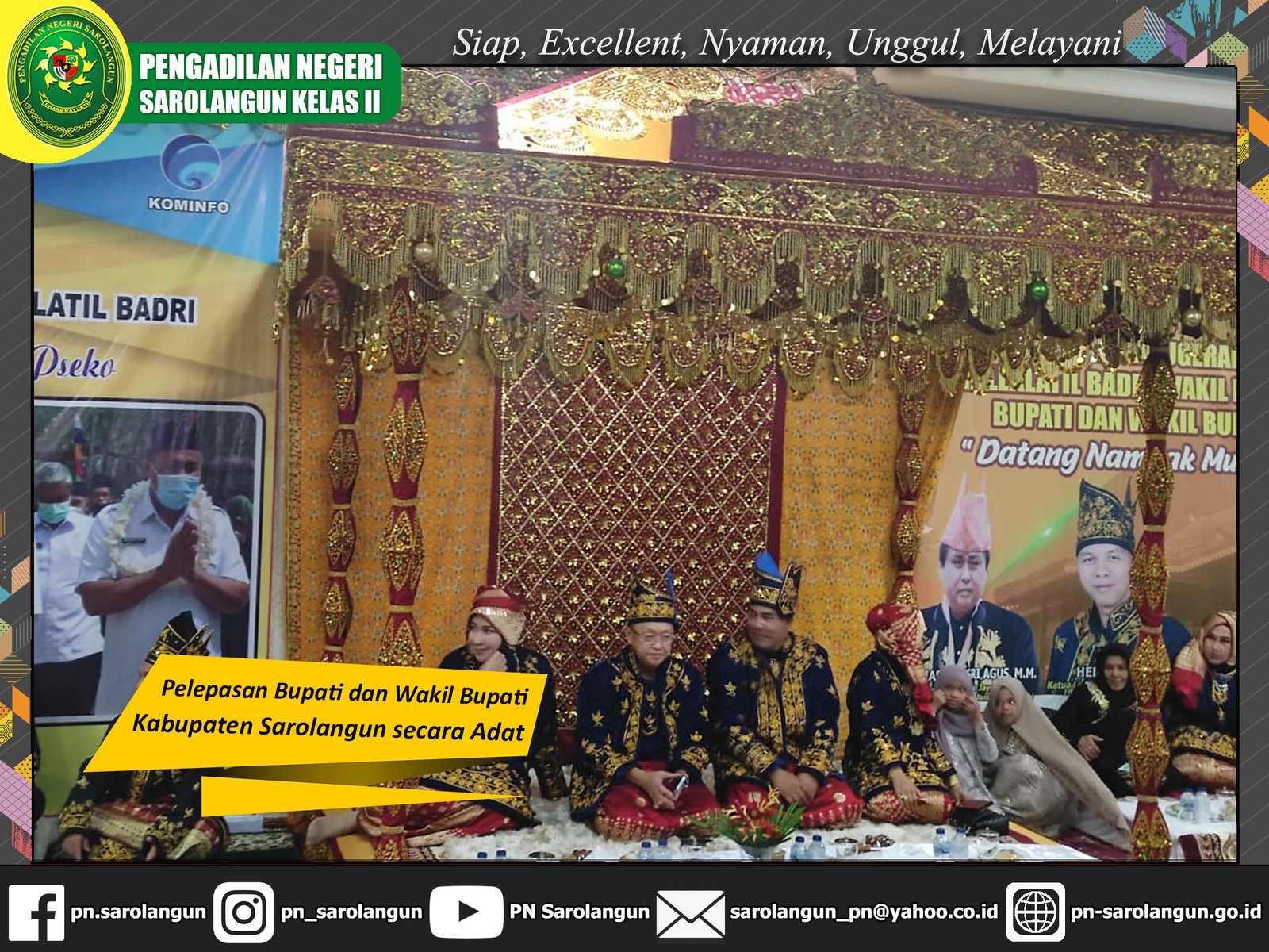 Selasa, 17 Mei 2022 - Bertempat di Rumah Dinas Bupati Kabupaten Sarolangun, Ketua Pengadilan Negeri Sarolangun, Ibu Deka Diana, S.H., M.H. menghadiri Acara Pelepasan Bupati dan Wakil Bupati Kabupaten Sarolangun secara Adat. Pelepasan Bupati dan Wakil Bupati Sarolangun ini dilakukan mengingat batas akhir jabatan pada 22 Mei mendatang. Selain itu, juga dilakukan penganugerahan gelar adat kepada Wakil Bupati Sarolangun, Bapak Hiallatil Badri dengan Gear Adipati Setio Negeri. Terima kasih kepada Bupati dan Wakil Bupati Sarolangun periode 2017 - 2022 atas segala upaya yang dilakukan dalam membangun Kabupaten Sarolangun.