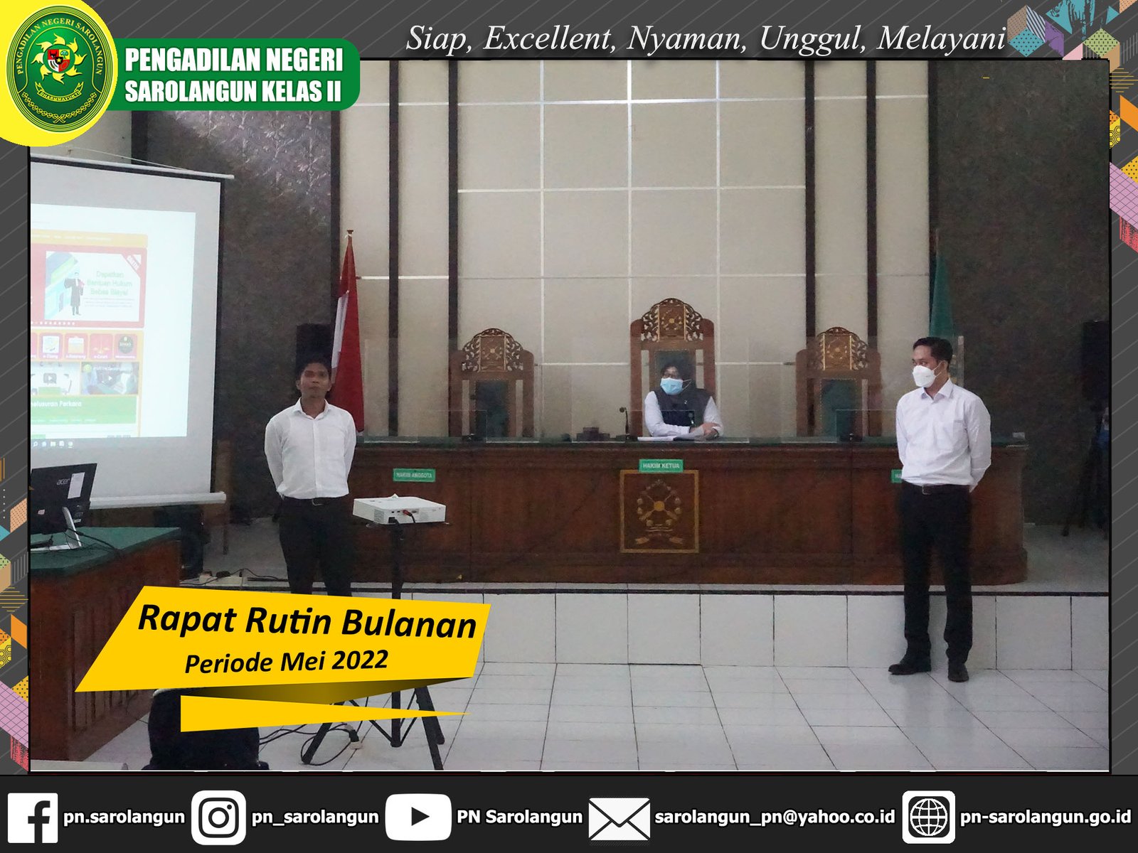 Senin, 09 Mei 2022 - Bertempat di ruang sidang Cakra Pengadilan Negeri Sarolangun, telah dilaksanakan Rapat Rutin Bulanan Periode Mei 2022. Rapat ini dipimpin langsung oleh Ketua Pengadilan Negeri Sarolangun, Ibu Deka Diana, S.H., M.H. Dalam kesempatan ini, kami juga mengadakan sesi perkenalan dua orang CPNS baru dari posisi Analis Perkara Peradilan, yaitu Swandi Hutabarat, S.H. dan William Edward Sibarani, S.H. Selamat datang di Pengadilan Negeri Sarolangun, semoga menjadi ASN yang berintegritas dan dan menjunjung nama baik Pengadilan Negeri Sarolangun.
