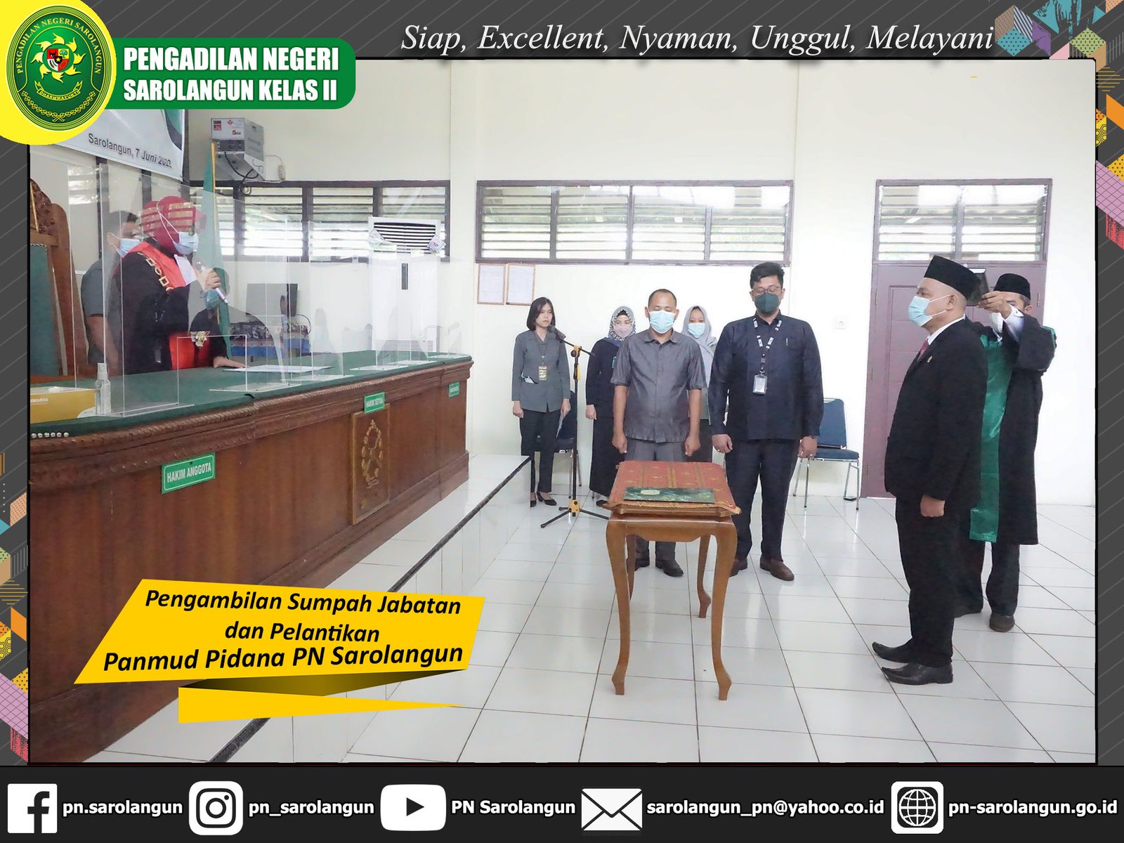 Selasa, 07 Juni 2022 - Bertempat di ruang Sidang Cakra Pengadilan Negeri Sarolangun, telah dilaksanakan Pengambilan Sumpah Jabatan dan Pelantikan atas Bapak Jhon Hendriansyah, S.H. sebagai Panitera Muda Pidana di Pengadilan Negeri Sarolangun.
