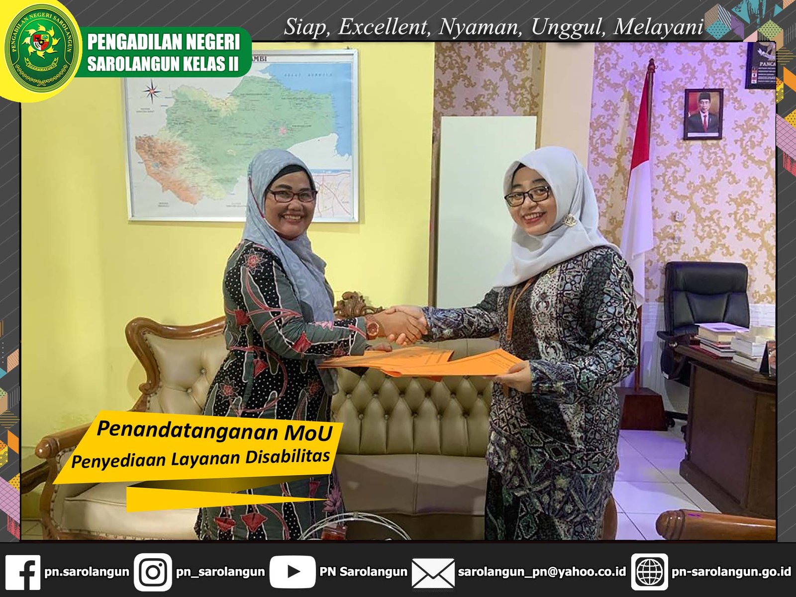 Kamis, 23 Juni 2022 - Bertempat di Pengadilan Negeri Sarolangun, Ketua Pengadilan Negeri Sarolangun, Ibu Deka Diana, S.H., M.H. menandatangani nota kesepahaman (MoU) dengan SLB Negeri Sarolangun dalam hal penyediaan layanan bagi Penyandang disabilitas di Pengadilan Negeri Sarolangun.
