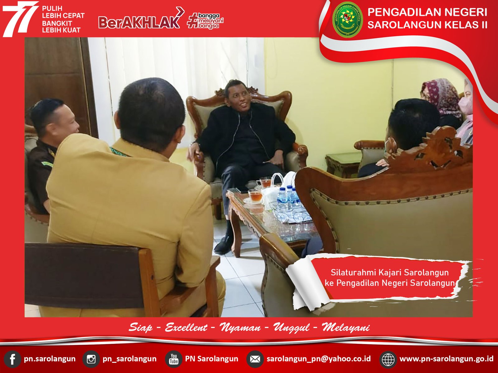 Selasa, 09 Agustus 2022. Ketua Pengadilan Negeri Sarolangun, Ibu Deka Diana, S.H. M.H. beserta Para Hakim, menerima silaturahmi Kepala Kejaksaan Negeri Sarolangun, Bapak Bobby Ruswin, S.H., M.H. Kunjungan Kajari ini adalah meningkatkan kerja sama yang baik antara Lembaga Pemasyarakatan Kelas IIB Sarolangun dengan Pengadilan Negeri Sarolangun.