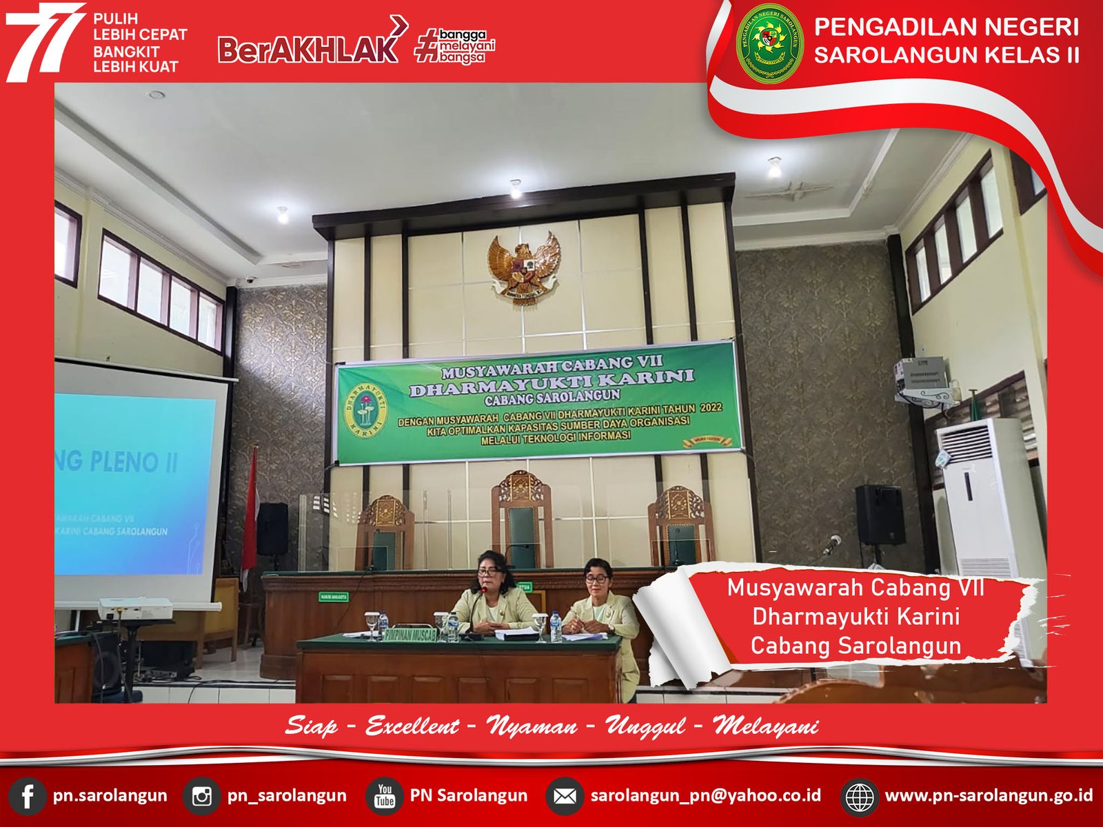 Jum'at, 12 Agustus 2022 - Pada hari yang sama dengan Pelantikan Pengurus Cabang, juga dilaksanakan Musyawarah Cabang VII Dharmayukti Karini Cabang Sarolangun. Musyawarah Cabang VII tahun 2022 ini mengusung tema "Dengan Musyawarah Cabang VII Dharmayukti Karini Tahun 2022 Kita Optimalkan Kapasitas Sumber Daya Organisasi Melalui Teknologi Informasi".
