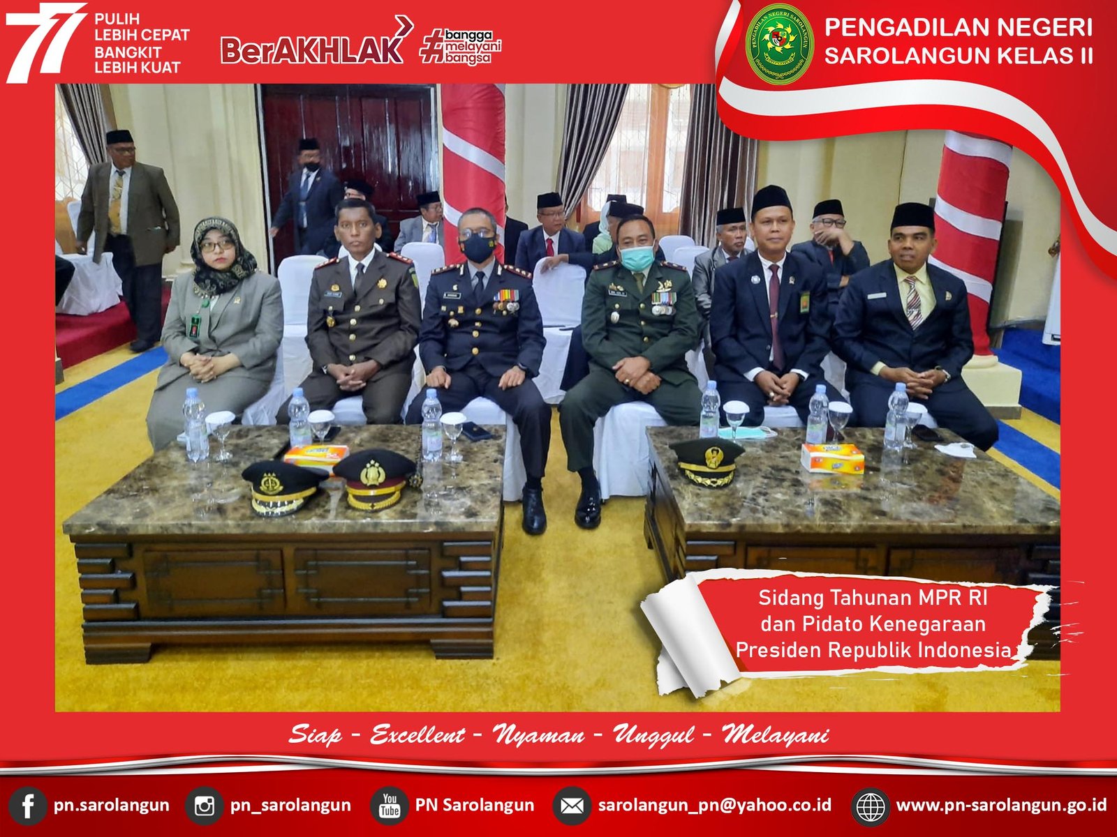 Selasa, 16 Agustus 2022 - Ketua PN Sarolangun, Ibu Deka Diana, S.H., M.H. menghadiri rapat paripurna istimewa yang digelar oleh DPRD Sarolangun dalam rangka mengikuti sidang tahunan MPR-RI dan Pidato Kenegaraan Presiden RI dalam rangka Hari Ulang Tahun (HUT) Kemerdekaan RI yang ke-77 secara virtual melalui Live Streaming Youtube Sekretariat Presiden di Ruang Sidang DPRD Kabupaten Sarolangun.