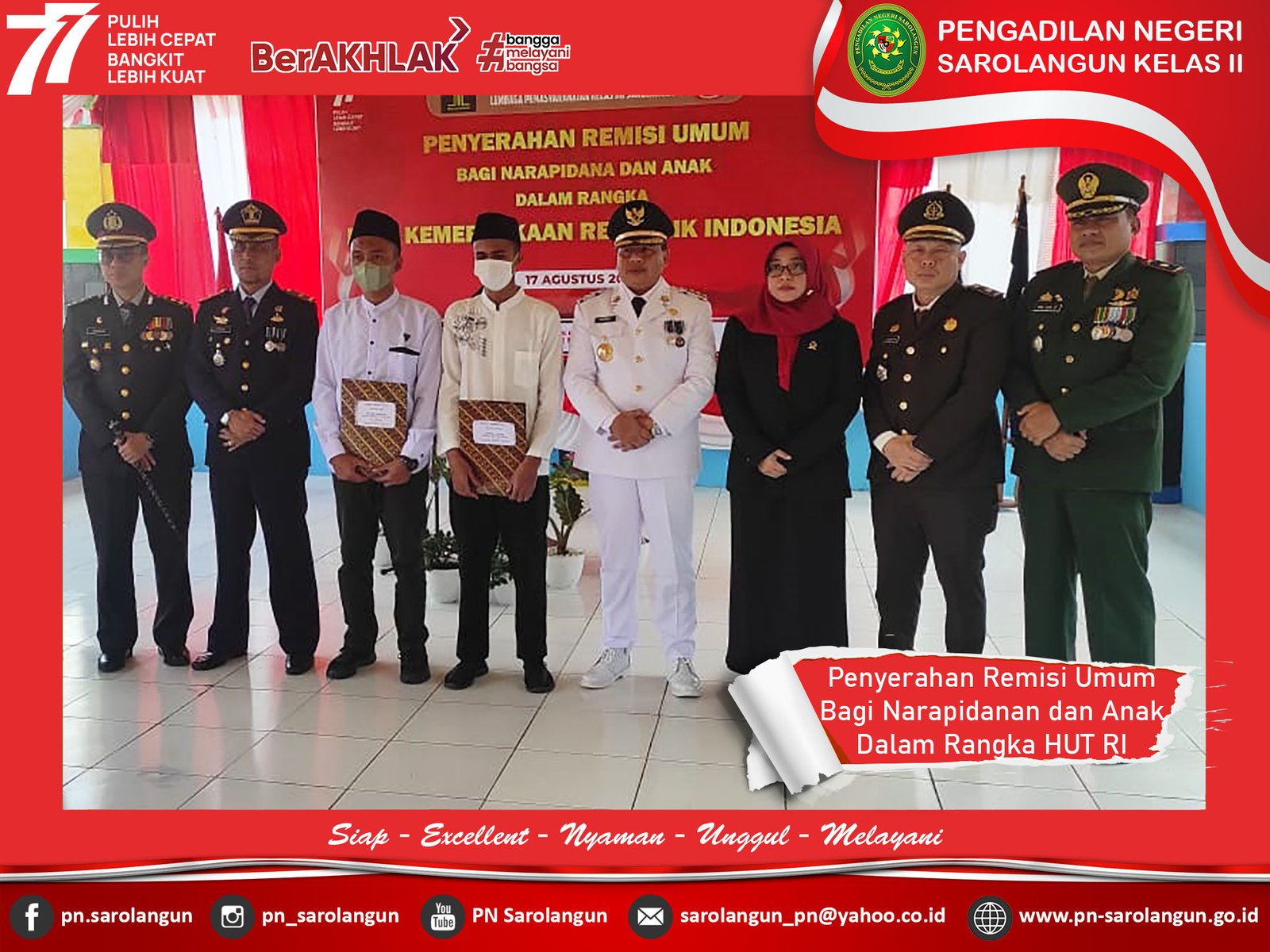 Rabu, 17 Agustus 2022 - Ketua PN Sarolangun, Ibu Deka Diana, S.H., M.H. mengikuti dan mendengarkan Pidato Kenegaraan Presiden Republik Indonesia dalam rangka menyabut Hari Ulang Tahun Ke-77 Republik Indonesia Tahun 2022 di Aula Kantor Bupati Sarolangun bersama dengan Unsur Muspida Kabupaten Sarolangun.