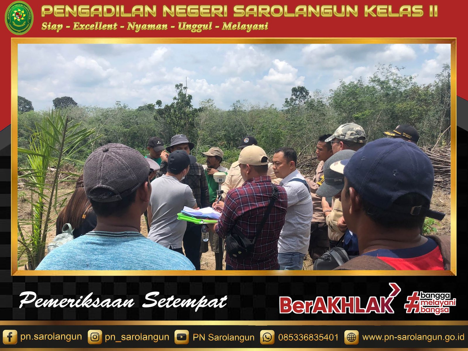 Jum'at, 09 September 2022 - Majelis Hakim Pengadilan Negeri Sarolangun, yang terdiri dari Bapak Raymon Haryanto, S.H., Bapak Tumpak Hutagaol, S.H. Reindra Jasper Sinaga, S.H., serta juga Panitera Pengganti Ibu Dedek Marinta Barus, S.H.. melakukan Sidang Pemeriksaan Setempat Barang Bukti Perkara Nomor Perkara: 11/Pdt.G/2022/PN Srl. Perkara ini adalah sengketa lahan di Desa Pematang Kabau, Kecamatan Air Hitam.