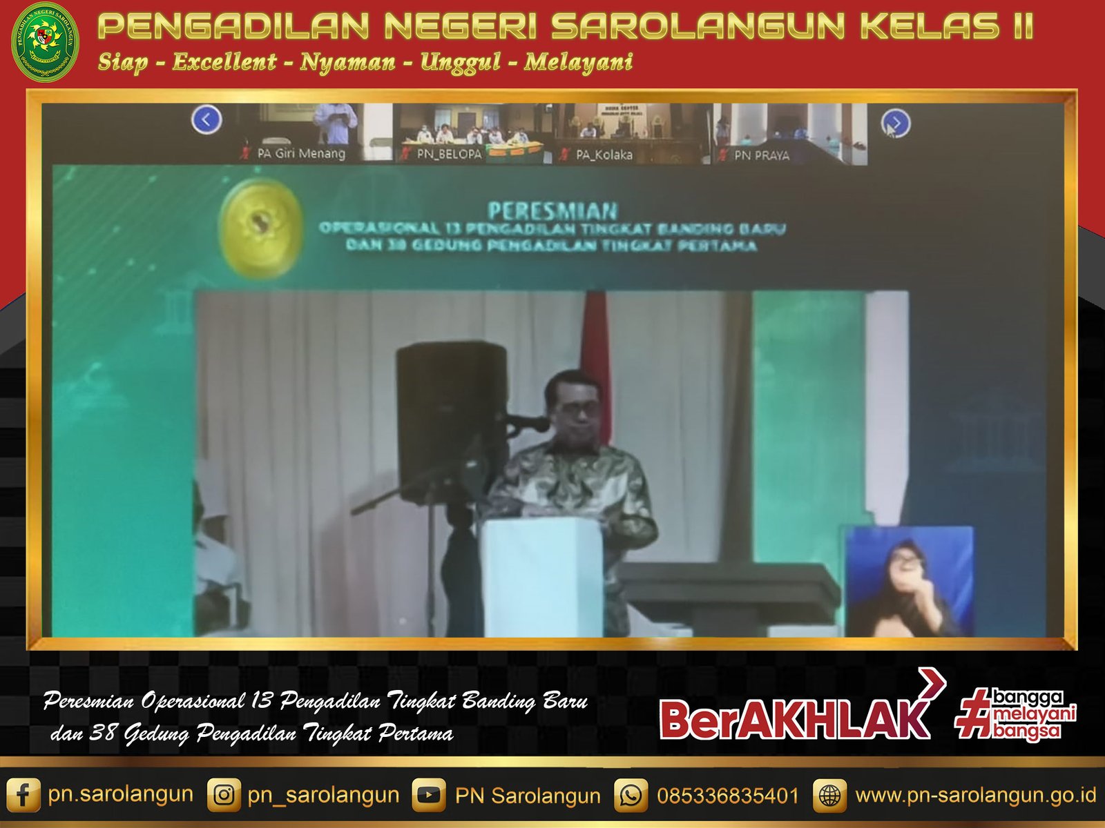 Seni, 05 Desember 2022 - Bertempat di Ruang Sidang Anak Pengadilan Negeri Sarolangun, telah dilaksanakan acara Peresmian Operasional 13 Pengadilan Tingkat Banding Baru dan 38 Gedung Pengadilan Tingkat Pertama secara daring. Peresmian ini langsung dilakukan oleh Ketua Mahkamah Agung Republik Indonesia, Prof. Dr. H. M. Syarifuddin, S.H., M.H.