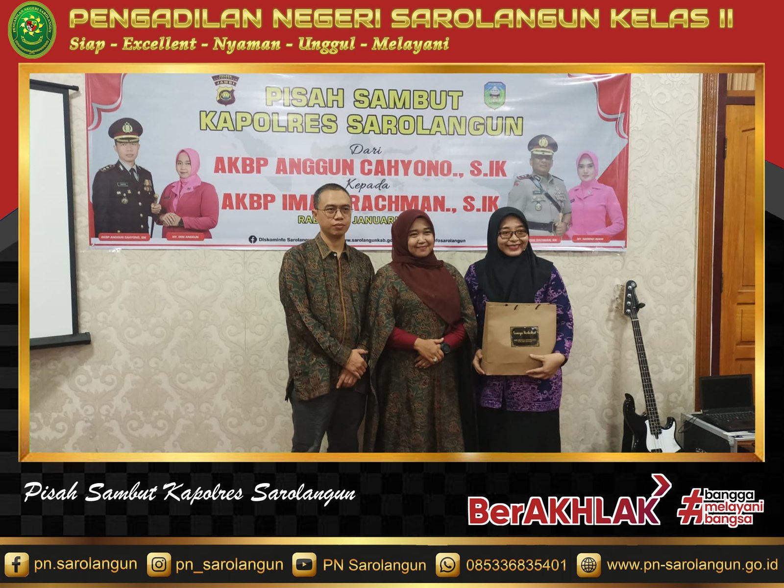 Rabu, 11 Januari 2023 - Ketua PN Sarolangun, Ibu Deka Diana, S.H., M.H. hadiri acara pisah sambut Kapolres Sarolangun dari AKBP Anggun Cahyono, S. Ik. kepada AKBP Imam Rachman.S.IK. Acara ini digelar di Aula Rumah dinas Bupati Sarolangun pada pukul 20.30.WIB. Terima kasih kepada AKBP Anggun Cahyono, S.IK. dan Selamat datang kepada AKBP. Imam Rachman, S.IK. di kabupaten Sarolangun.