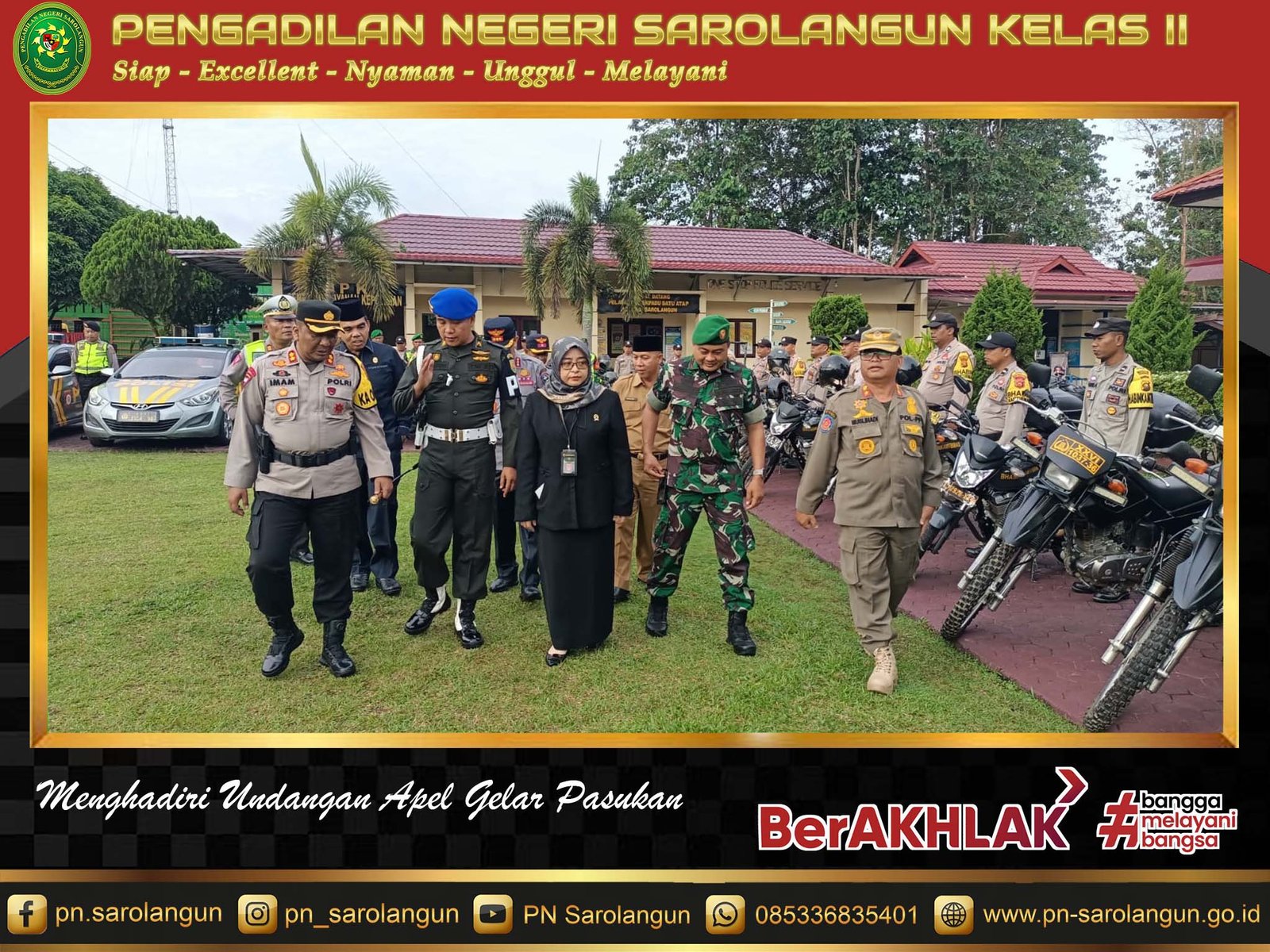 Selasa, 07 Februari 2023 - Ketua PN Sarolangun, Ibu Deka Diana, S.H., M.H. menghadiri undangan Polres Sarolangun dalam acara Apel Gelar Pasukan Operasi Keselamatan 2023, Keselamatan Berlalu Lintas yang Pertama dan Utama. Ketua PN Sarolangun hadir di acara ini bersama dengan Forkopimda Kabupaten Sarolangun, Para PJU, Para Kapolsek Jajaran, Para Perwira serta tamu undangan lainnya.