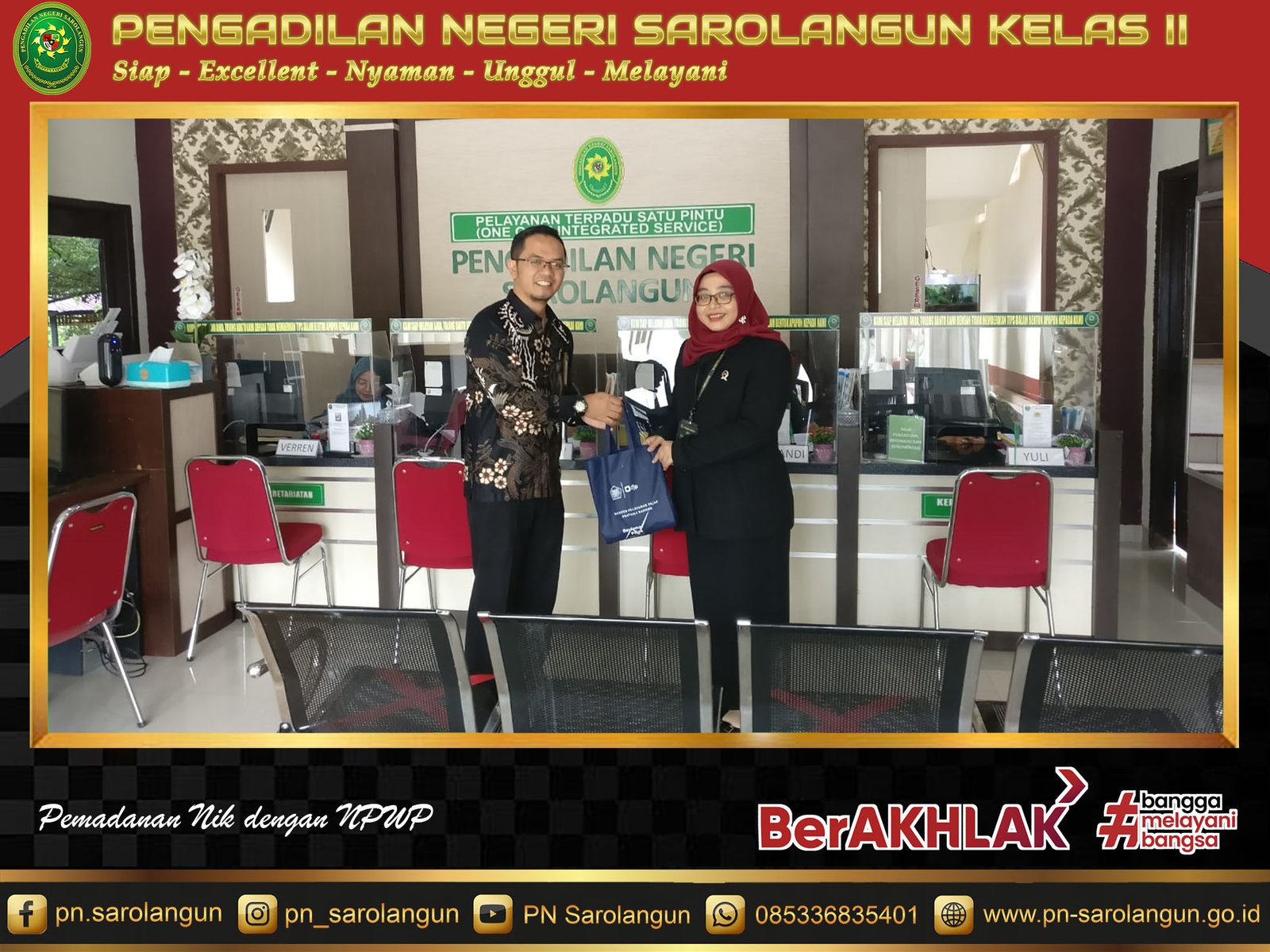 Selasa, 21 Februari 2023 - Kepala KP2KP Sarolangun, Sef Rico Fatman, S.E., M.A. berkunjung ke Pengadilan Negeri Sarolangun untuk melakukan sosialisasi integrasi Nik menjadi NPWP dan Pelaporan SPT Tahunan. Kedatangan KP2KP Sarolangun ini disambut baik oleh Ketua PN Sarolangun, Ibu Deka Diana, S.H., M.H.