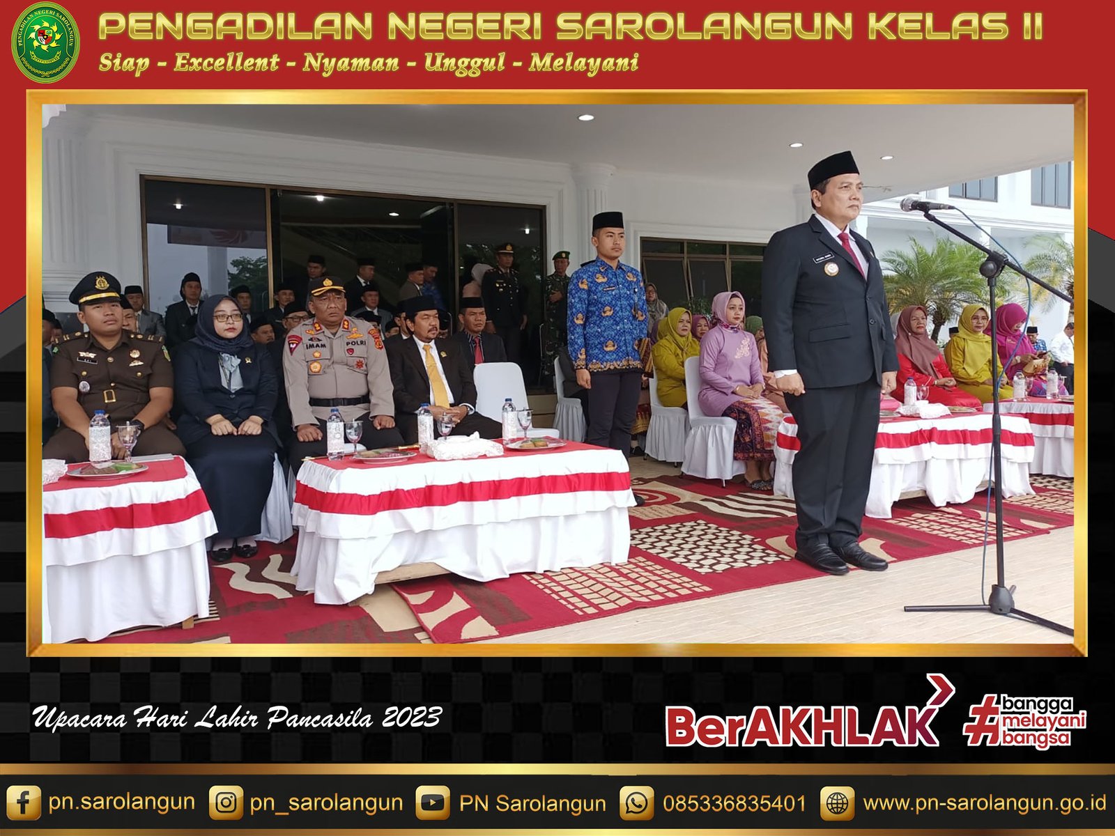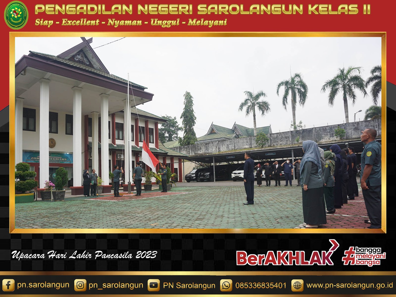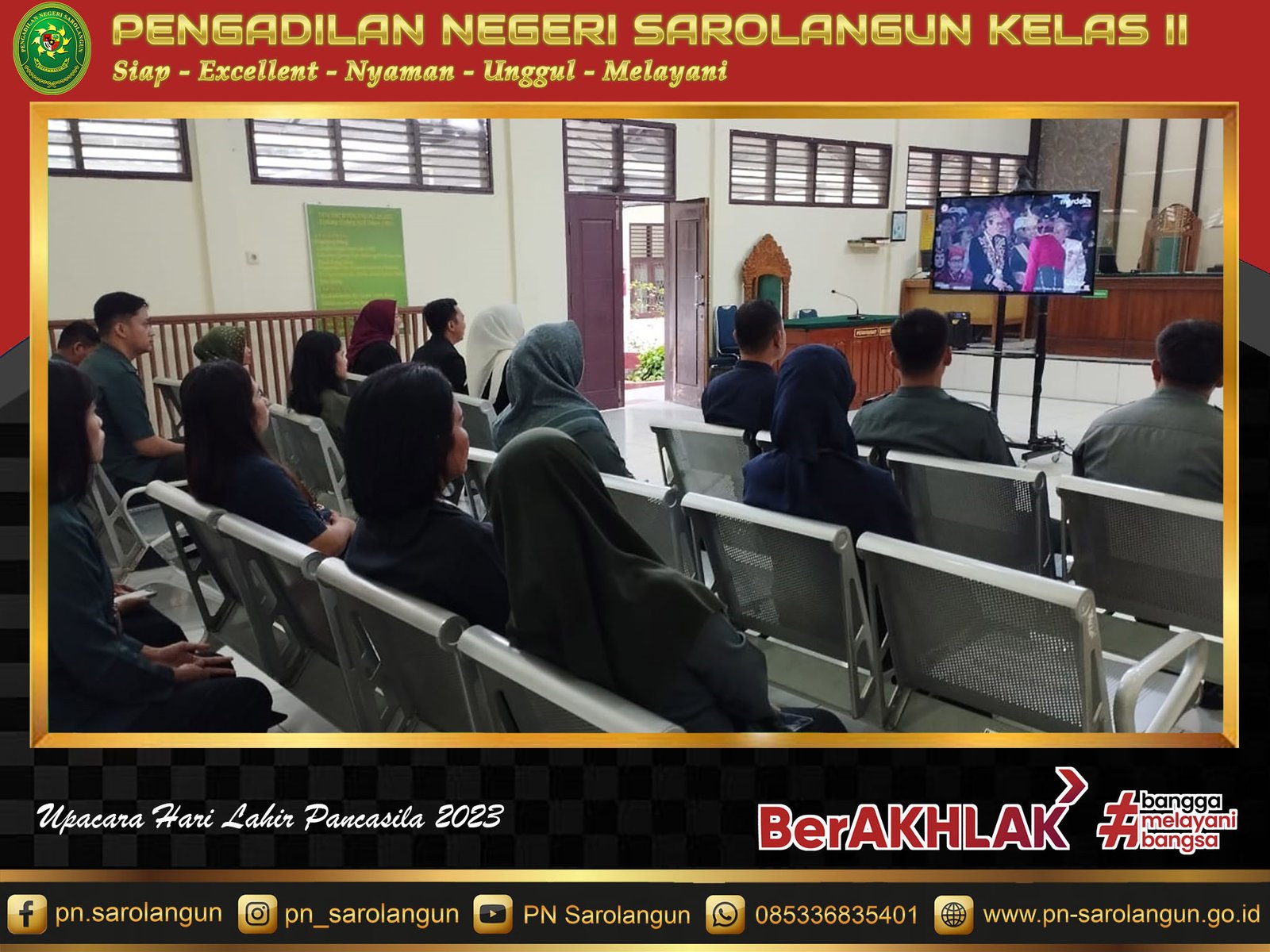 Upacara Hari Lahir Pancasila pada Tahun 2023 ini bertemakan "Gotong Royong Membangun Peradaban dan Pertumbuhan Global". Setelah selesai mengikuti upacara, Hakim dan Aparatur PN Saroalngun kemudian menyaksikan siaran langsung Upacara Peringatan Hari Lahir Pancasila lewat youtube BPIP di Ruang Sidang Cakra PN Sarolangun.