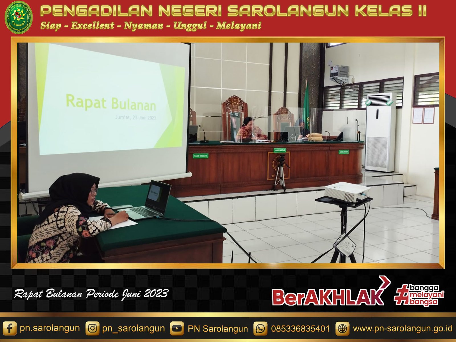 Jum'at, 23 Juni 2023 - Pimpinan bersama ASN dan PPNPN Pengadilan Negeri Sarolangun melaksanakan rapat koordinasi bulan Juni 2023. Rapat dilaksanakan di Ruang Sidang Cakra sekitar pukul 08.00 WIB.