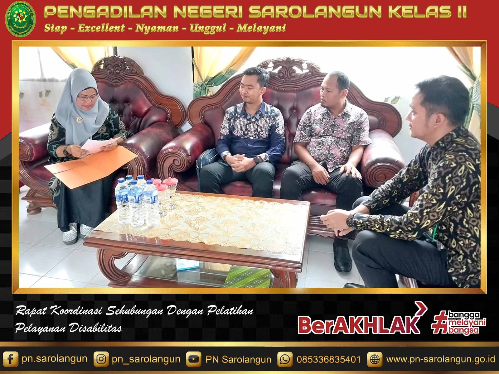 Rapat koordinasi ini bertujuan untuk menjalin kerjasama antara SLB Negeri Sarolangun dan Pengadilan Negeri Sarolangun untuk menrencanakan jadwal pelatihan pelayanan bagi Pegawai PN Sarolangun dalam melayani Penyandang disabilitas.